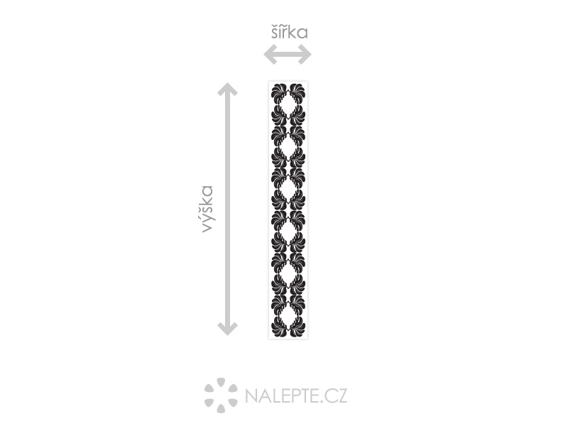 Abstraktní štýlová dekorácia na stenu hodící ako do chodieb, spální i obívacích izieb. Je možné kombinovať více pruhov ved¾a seba a vytvára tak opakující sa textúry napodobnící štýl tapety. Jedná sa vždy o bílý podklad - bílou samolepící fóliu, ktorá je potlačená ornamentami vo vámi vybrané farbe. Je možné voli vlastní rozmer teda výšku pruhu presne prispôsobiť výšce vaší múru. Není možné zvoliť bielu farbu 010 alebo jednu z metalickích farieb: 090 stri&br; Ak zvolíte jednu z týchto farieb budete kontaktováni ohľadne zmeny farby alebo zrušení objednávky.
