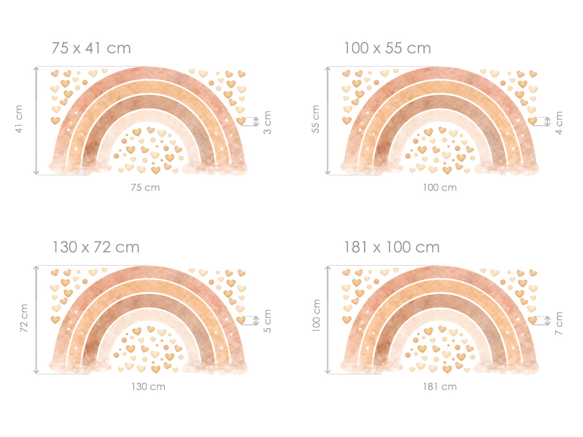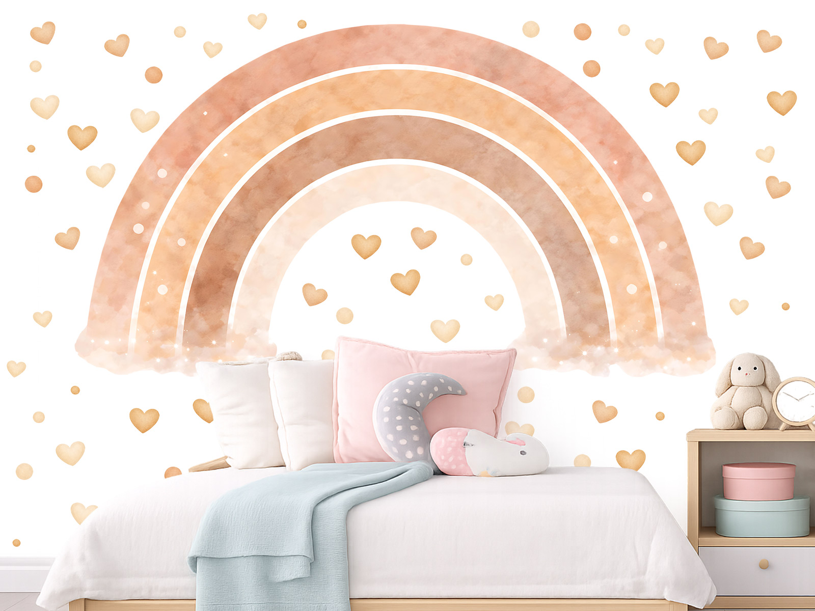 Akvarelová dúha v štýle boho vnesie do detskej izby jemnú, pokojnú a teplú atmosféru inšpirovanú štýlom boho. Ručne maľovaný akvarelový vzhľad v prírodných odtieňoch béžovej, púdrovej ružovej a teplej broskyňovej farby pôsobí veľmi ľahko a nadčasovo, vďaka čomu sa nálepka perfektne hodí do detských izieb aj izieb starších detí. Dúhu dopĺňajú drobné srdiečka, ktoré dodávajú celej kompozícii jemný a hravý detail, bez toho aby rušili. Motív je navrhnutý tak, aby na stene pôsobil vzdušne a prirodzene, ľahko sa stal stredobodom nad detskou postieľkou alebo posteľou a zároveň harmonicky ladil s ostatnými dekoráciami. Balíček obsahuje list s jednotlivými prvkami v uvedených rozmeroch, čo vám umožňuje vytvoriť si vlastné usporiadanie podľa priestoru a vašej fantázie, čím interiéru dodáte výrazný, rozprávkový a pokojný charakter.