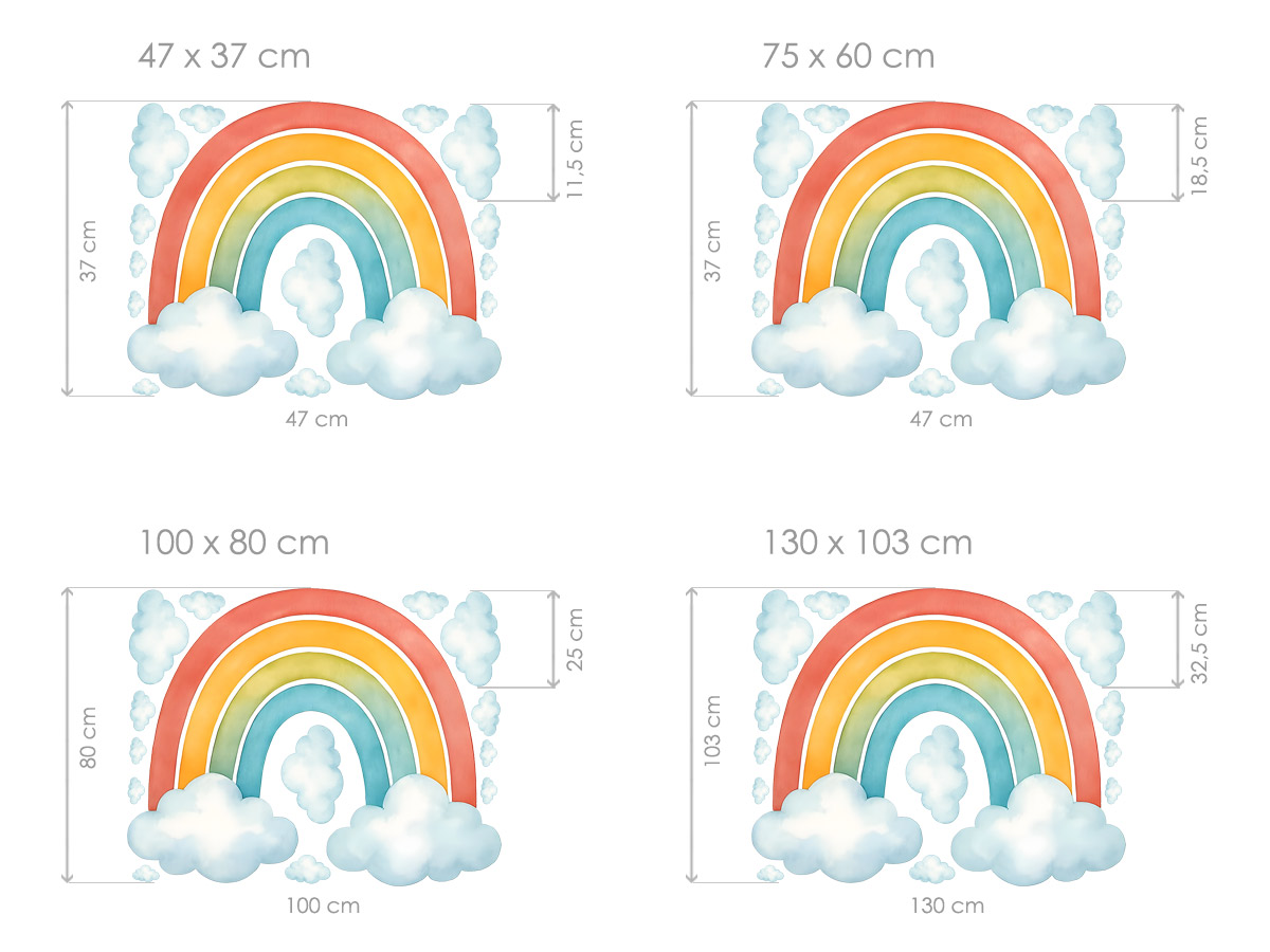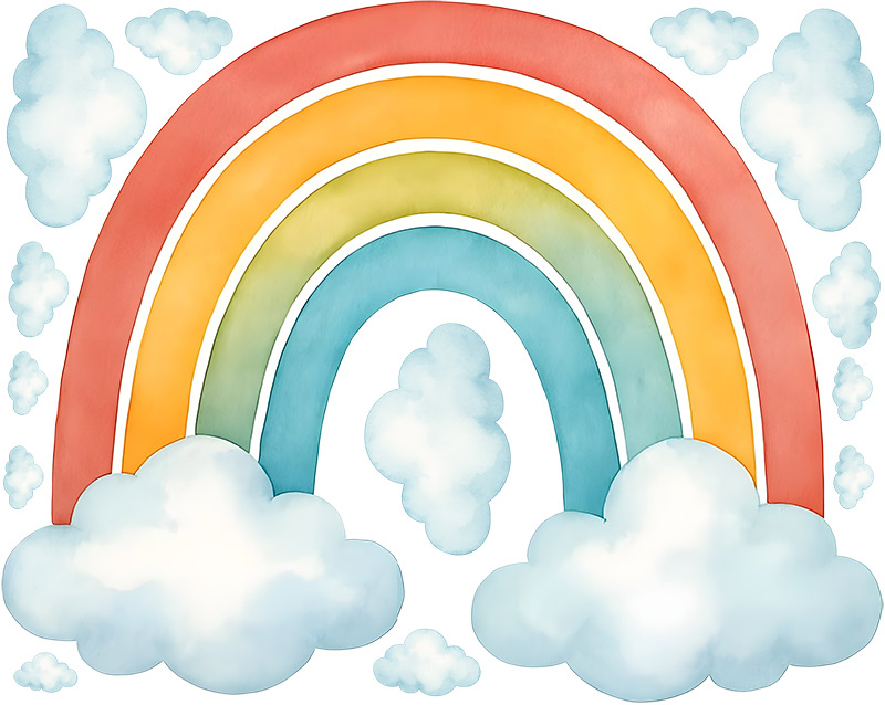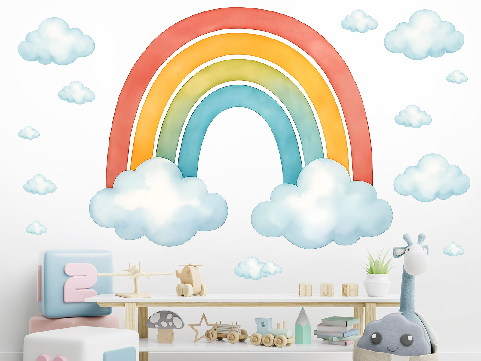 Samolepka na stenu „Akvarelová dúha“ dodá každému detskej izbe jemnú, hravú a radostnú atmosféru díky svojmu nežnému malovanému vzh&aduhu v štýle akvarelu. Mäkké prechody farieb od teplé červené cez žltú až po upokojující modré tóny vytárejí harmonický motív, ktorý pôsobí ľahko a optimisticky. Dúha je obklopená nadýchanými obláčkami v rôznychých veľkostiach, ktoré celý motív krásne zjemňují a dodávají mu kúzelný, snový charakter. Celok pôsobí ako ilustrácia z pohádkové knížky a ľahko sa stane dominantním prvkom steny, ktorý rozjasní priestor a vytvorí v ňom príjemnú a útulnú atmosféru. Na priložen&m archu je vše prehľadne usporéno, aby finální kompozícia pôsobila vyvážene a zachovala si svoj akvarelový pôvab.