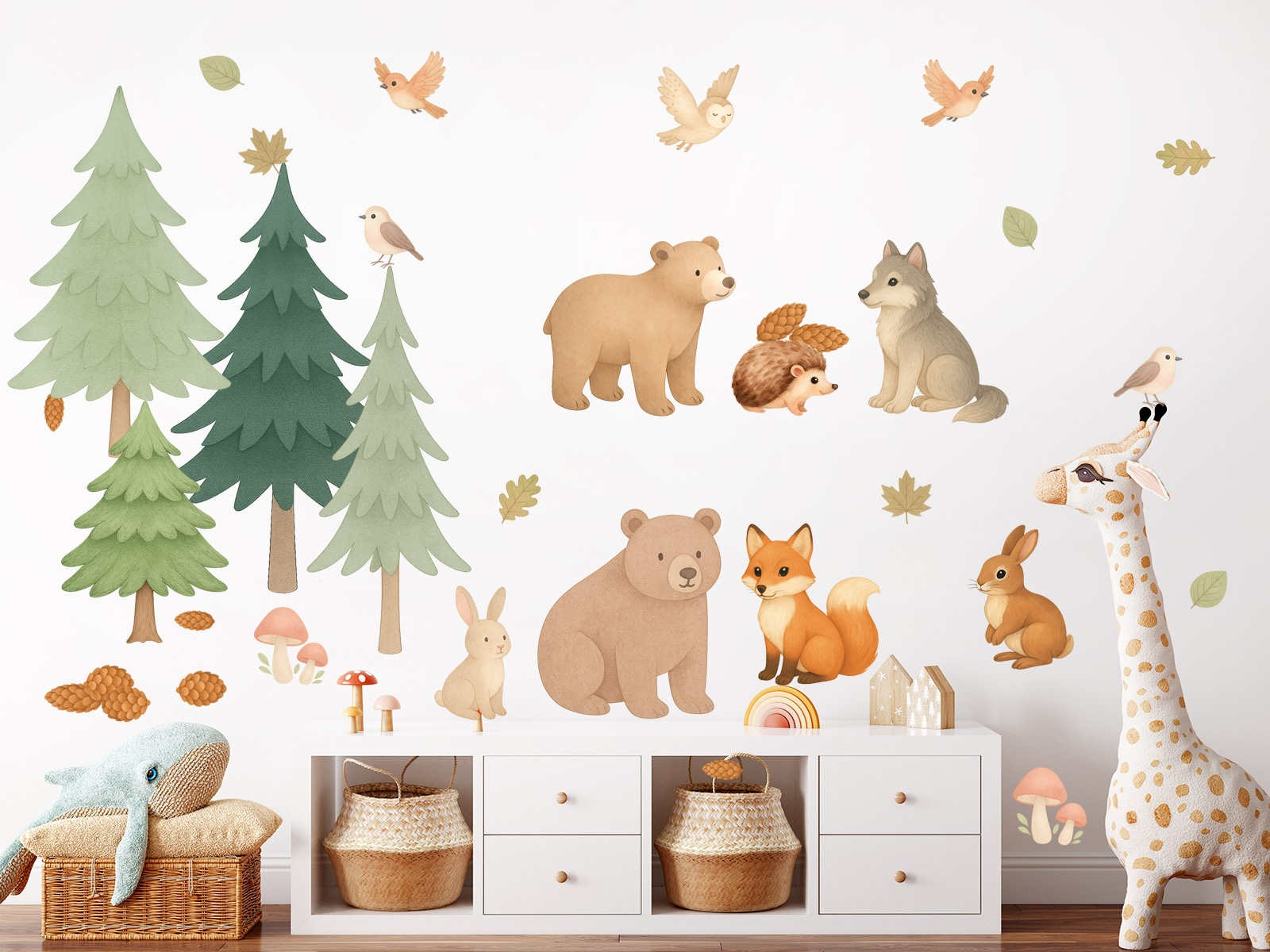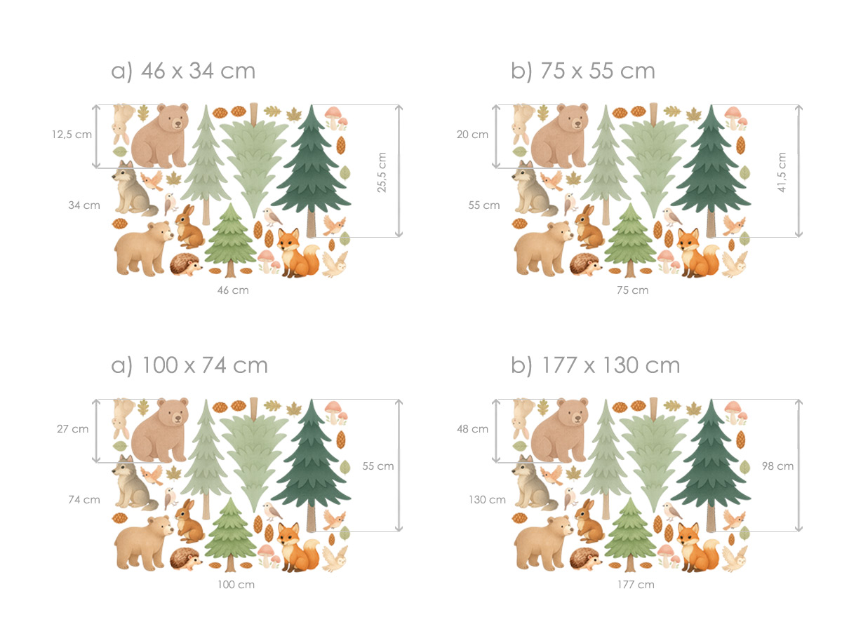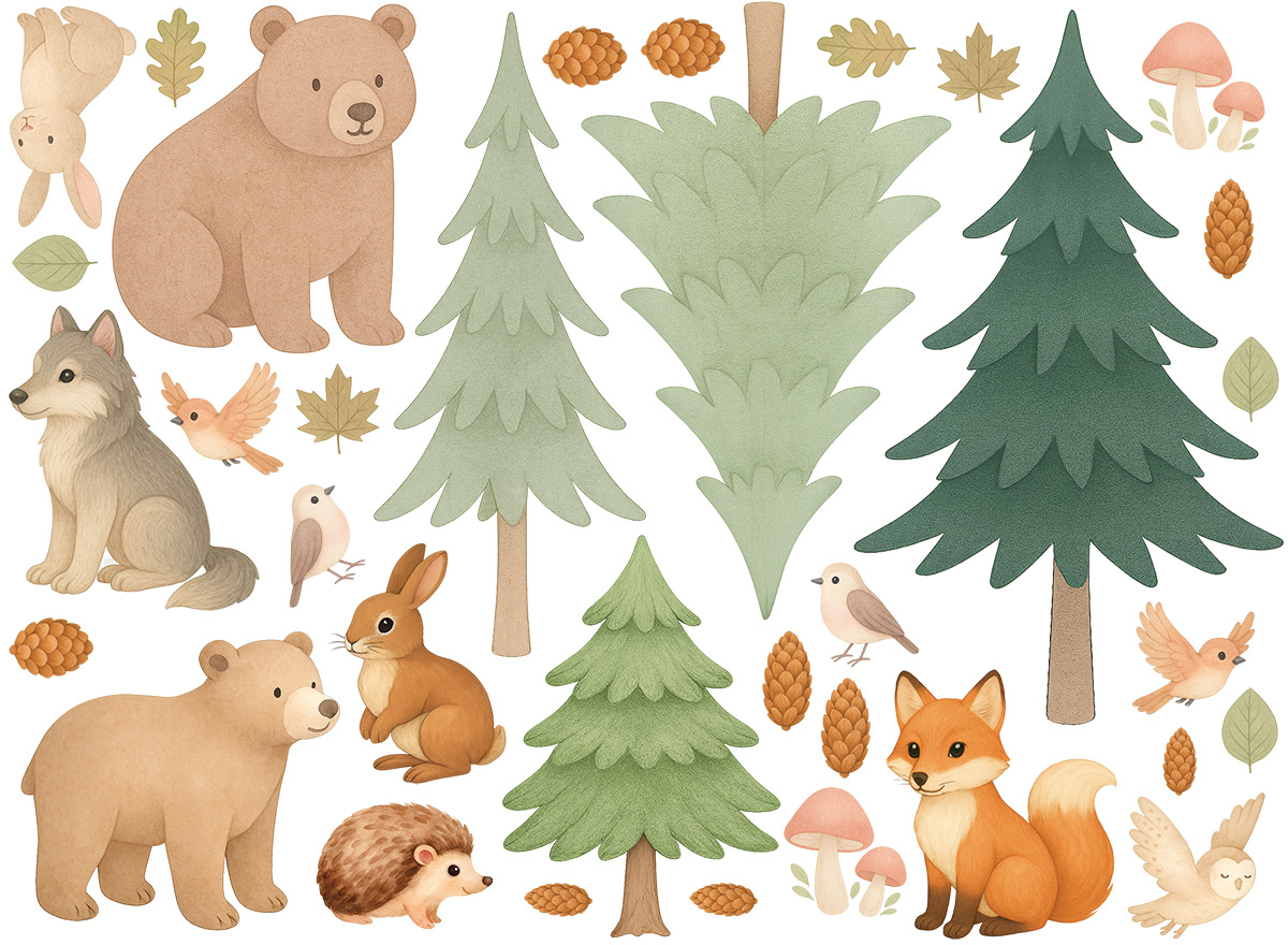Vneste do detskej izby kúzlo lesa!Naše sada Akvarelová lesní zvírátka premení každú stenu v jemnú prírodní scénu plnú roztomilích zvírátok, stromov a lesních detailov. Všetky motívy sú ručne ilustrované v jemnomém akvarelovém štýle, pôsobí hrejivo, pokojne a harmonicky – ideální pre útulné a hravé prostredí detského izby. Čo sada obsahuje:- 2 medvediaky;- lišku, vlčka, ježka, zajaíčky a vtáky- 3 rôzneé smrečky- hubky, šišky a listy ako doplnky pre dotvorení celé scény Motívy je možné ľubovoľne kombinovať a rozmiestniť podľa veľkosti steny alebo osobní fantázie – vytvoríte si vlastní lesní pohádku.