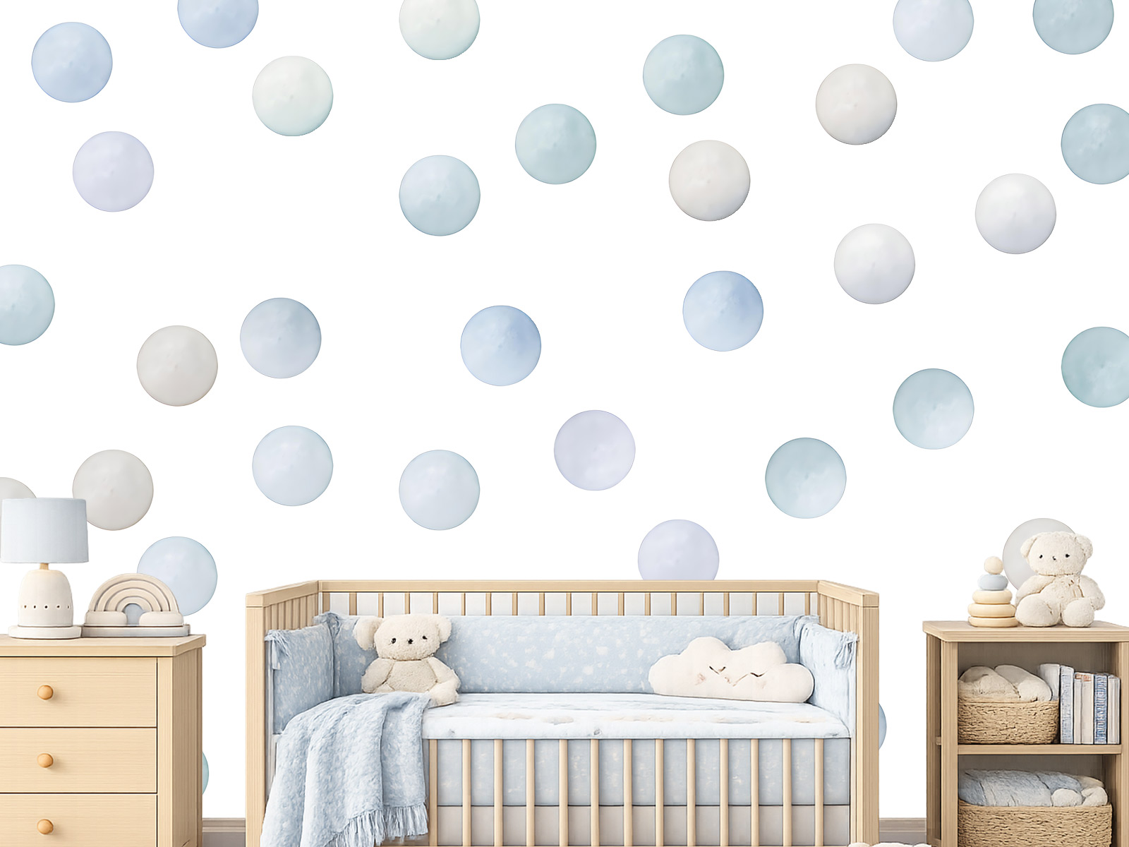 Nálepky na stenu Akvarelové bodky v severskom štýle sú jemnou a modernou dekoráciou, ktorá krásne doplní detskú izbu v prírodných a tlmených farbách. Kombinácia svetlo modrej, šedej a neutrálnych odtieňov vytvára veľmi harmonickú a pokojnú atmosféru, ideálnu na relaxáciu a každodenné hry.