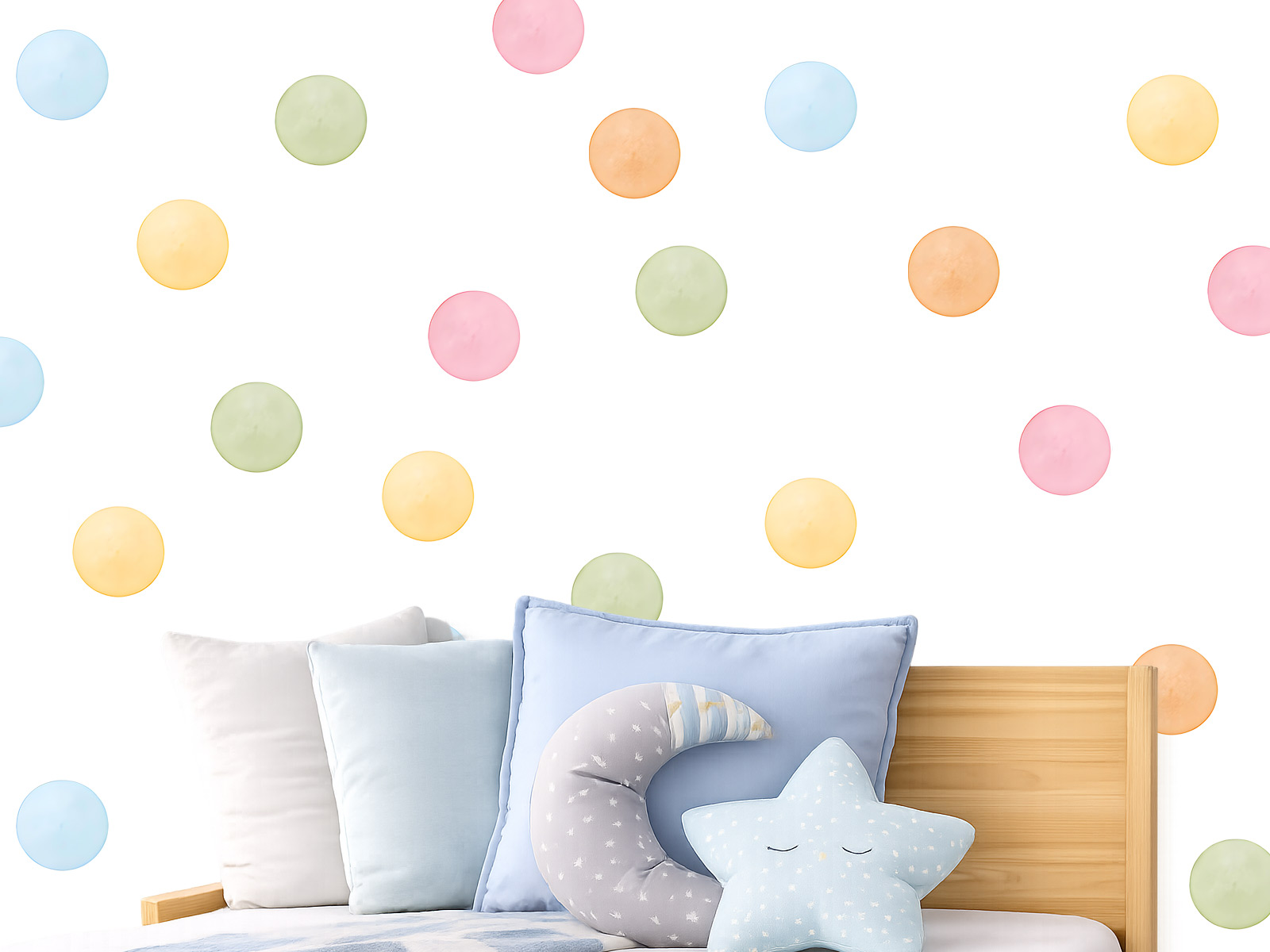 Nálepky na stenu Watercolour Pastel Polka Dot sú hravou a jemnou dekoráciou, ktorá dokáže premeniť detskú izbu na farebné a útulné miesto. Kombinácia pastelových odtieňov ružovej, modrej, žltej, zelenej a marhuľovej farby vytvára na stene veselý, ale jemný efekt. Vďaka akvarelovému štýlu majú bodky jemné farebné prechody a maľovaný vzhľad, ktorý pôsobí prirodzene a elegantne.