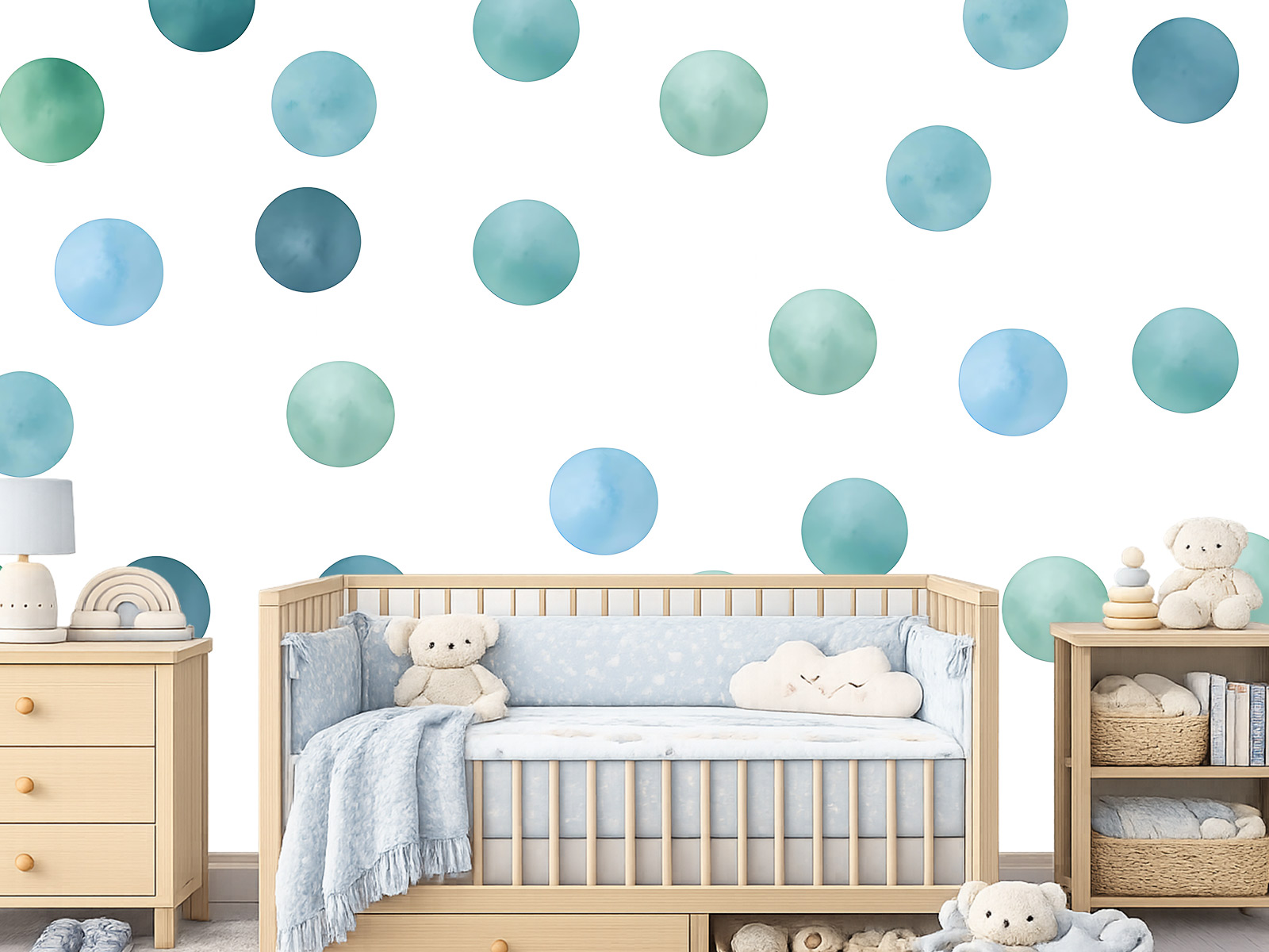 Nálepky na stenu Akvarelové bodky v odtieňoch modrej a zelenej farby sú krásnou dekoráciou, ktorá dodá detskej izbe sviežu a pokojnú atmosféru. Jemné odtiene modrej, tyrkysovej a zelenej vytvárajú harmonickú kombináciu inšpirovanú prírodou a morom. Vďaka akvarelovému štýlu majú bodky jemné farebné prechody a ľahko namaľovaný vzhľad, ktorý pôsobí prirodzene a veľmi príjemne na stene.