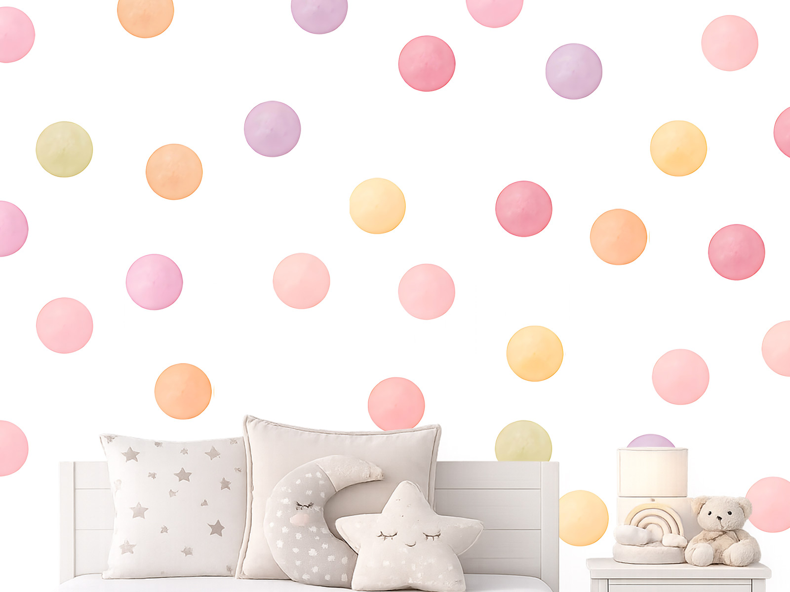 Veľkou výhodou je možnosť umiestniť nálepky na stenu presne podľa vašich predstáv. Bodky môžete rozmiestniť po celej stene, vytvoriť pravidelný vzor alebo len jemný dekor nad detskou postieľkou alebo detskou posteľou. Vďaka rôznym pastelovým odtieňom vzniká na stene hravý, ale harmonický efekt, ktorý dodáva detskej izbe útulnosť, jemnosť a jedinečný štýl.