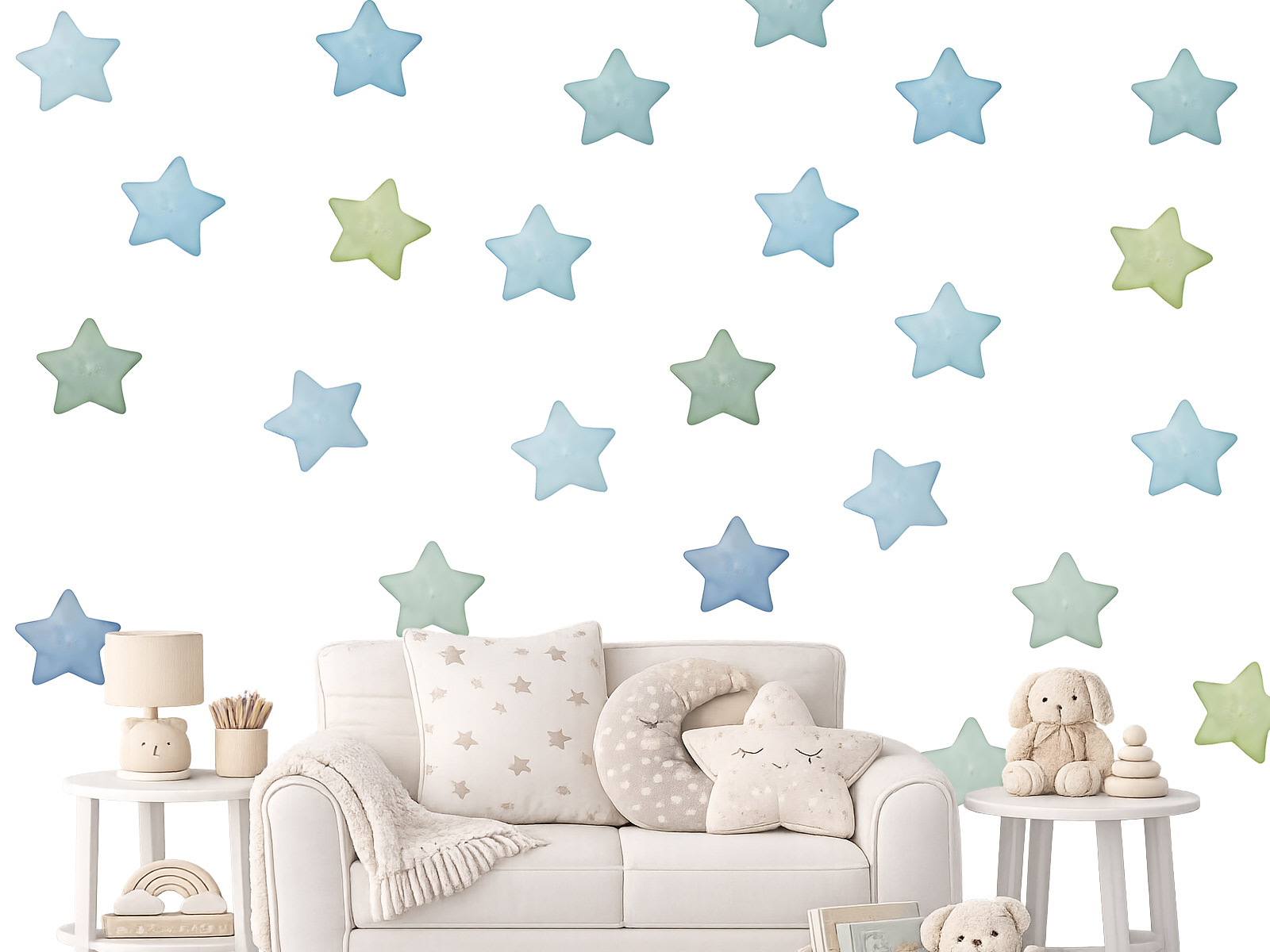 Nálepky na stenu Akvarelové hviezdy pre chlapcov sú jemnou a hravou dekoráciou, ktorá krásne doplní detskú izbu v pokojných prírodných farbách. Kombinácia modrých, zelených a jemne sivých odtieňov vytvára harmonickú farebnú paletu, ktorá pôsobí sviežo, prirodzene a zároveň veľmi útulne. Vďaka akvarelovému štýlu majú hviezdičky jemné farebné prechody a vyzerajú ako ručne maľované. Tieto nálepky na stenu sa skvele hodia do chlapčenských izieb, kde chcete vytvoriť pokojnú a príjemnú atmosféru na oddych aj hranie. Farebná kombinácia inšpirovaná prírodou krásne ladí so svetlým nábytkom, drevenými prvkami aj modernými škandinávskymi interiérmi. Nálepky môžete rozmiestniť presne podľa vlastnej fantázie. Hviezdy môžete rozmiestniť po celej stene, vytvoriť pravidelný vzor alebo len jemnú dekoráciu nad detskou postieľkou či detskou posteľou. Výsledkom je jednoduchá, ale veľmi pôsobivá dekorácia, ktorá dodá detskej izbe pokojnú, hravú a čarovnú atmosféru.