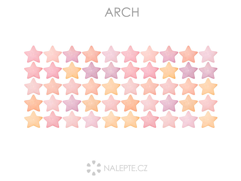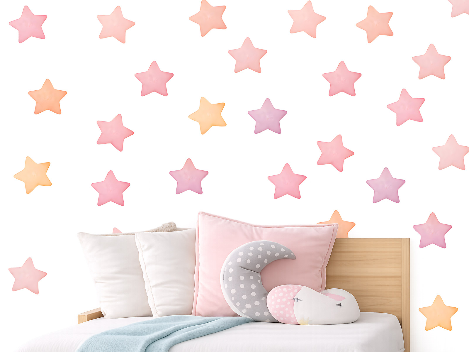 Nálepky na stenu Akvarelové hviezdy pre dievčatá sú jemnou a hravou dekoráciou, ktorá detskej izbe dodá nežnú a veselú atmosféru. Kombinácia ružových, marhuľových, broskyňových a jemne fialových odtieňov vytvára krásnu pastelovú paletu, ktorá pôsobí veľmi nežne a harmonicky. Vďaka akvarelovému štýlu majú hviezdičky jemné farebné prechody a vyzerajú ako ručne maľované. Tieto nálepky na stenu sú ideálne do detských izbičiek, kde chcete vytvoriť rozprávkovú a útulnú atmosféru. Pastelové farby sa ľahko kombinujú so svetlým nábytkom, prírodnými materiálmi aj ďalšími jemnými dekoráciami, takže izba pôsobí príjemne a harmonicky. Nálepky môžete rozmiestniť presne podľa vlastnej fantázie. Hviezdičky môžete rozmiestniť po celej stene, vytvoriť pravidelný vzor alebo len jemný dekor nad detskou postieľkou či posteľou. Vďaka tomu ľahko vytvoríte originálnu dekoráciu, ktorá premení detskú izbu na čarovné a útulné miesto plné hviezd.
