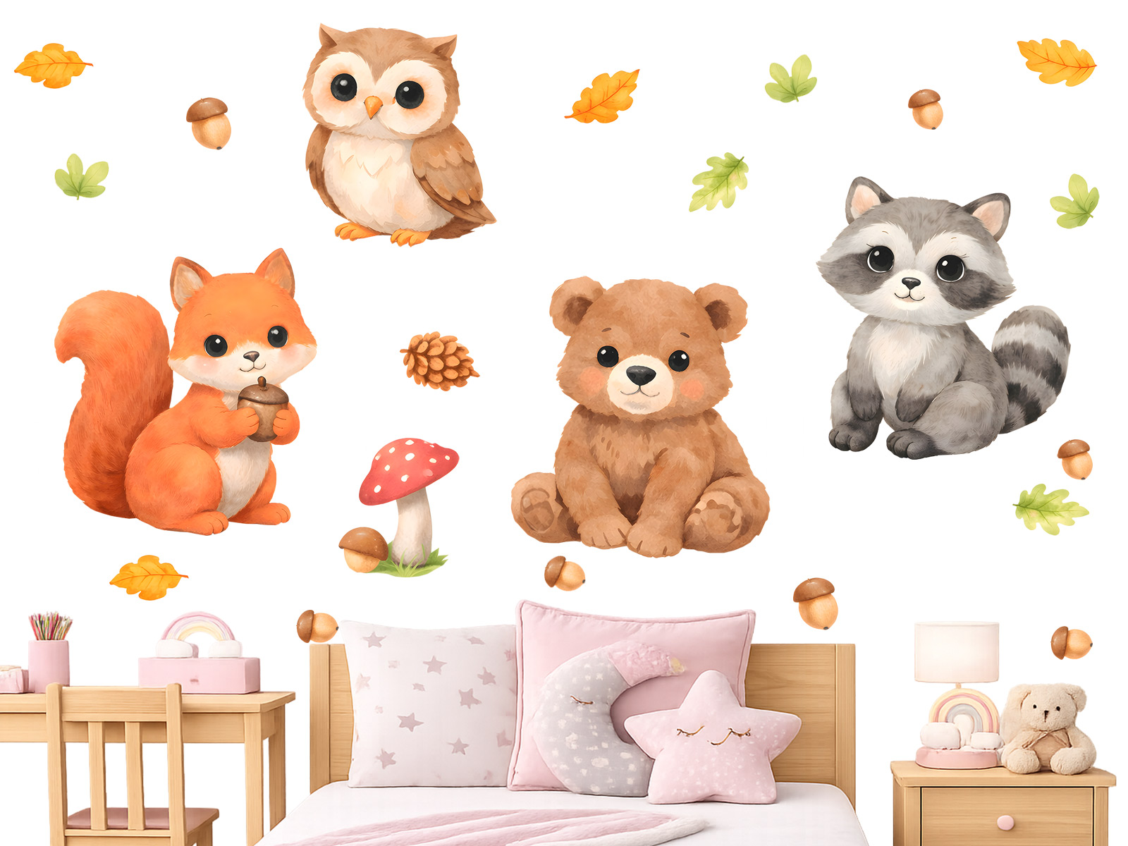 Táto jemná akvarelová kolekcia lesných zvierat prináša do detskej izby pokojnú a teplú atmosféru inšpirovanú prírodou. Roztomilý medveď, líška, medvedík čistotný a sova, doplnené jesenným lístím, žaludmi a hubami, vytvárajú harmonickú scénu plnú nehy a fantázie, ktorá má upokojujúci účinok a podporuje pocit bezpečia. Vďaka jemným farbám a detailnému spracovaniu sa motív ľahko začlení do rôznych štýlov detských interiérov a stane sa prirodzenou súčasťou priestoru na oddych, hry a snenie.