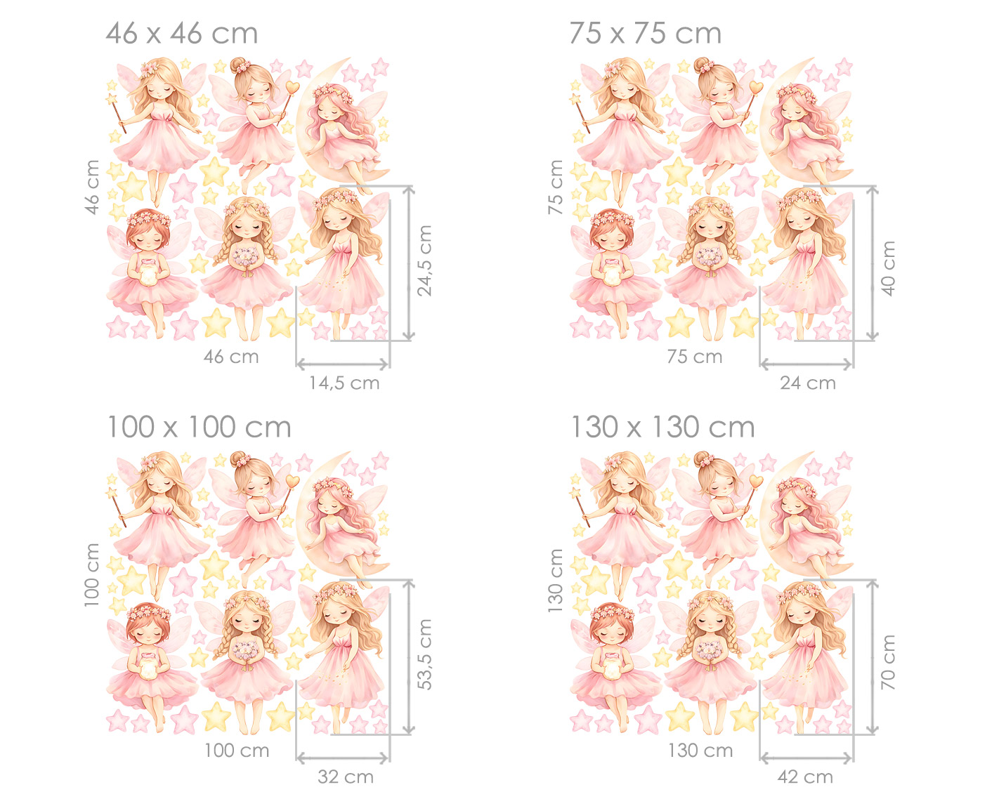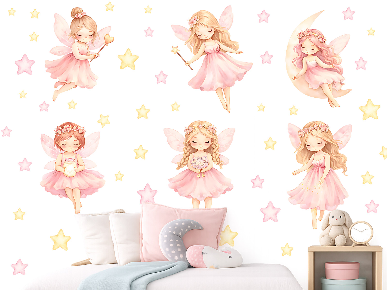 Nálepka na stenu „Akvarelové ružové víly“ premení detskú izbu na čarovný svet plný nežnosti a fantázie. Roztomilé víly v jemných ružových šatôčkach s krehkými krídlami pôsobia ako z rozprávky a vytvárajú snovú atmosféru. Akvarelové spracovanie dodáva ilustráciám jemnosť, ľahkosť a prirodzené farebné prechody. Každá víla má svoj jedinečný výraz aj detaily a spolu s hviezdičkami vytvárajú harmonickú a hravú kompozíciu plnú mágie. Nálepka je ideálna do detskej izby, najmä nad posteľ alebo do kútika na hranie, kde podporí detskú predstavivosť a pocit bezpečia. Vďaka samostatným prvkom je možné rozloženie prispôsobiť podľa vlastného priestoru. Perfektná voľba na vytvorenie jemného, rozprávkového prostredia, v ktorom sa každá malá víla bude cítiť ako doma.