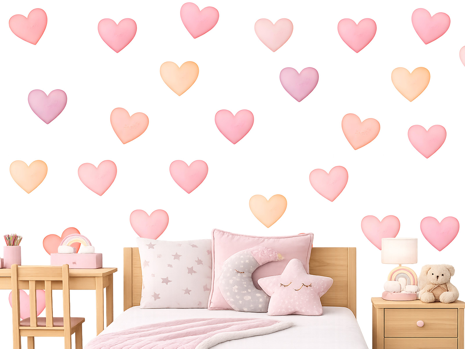 Nálepky na stenu Akvarelové srdiečka pre dievčatá sú jemnou a roztomilou dekoráciou, ktorá detskej izbe dodá nežnú a hravú atmosféru. Kombinácia pastelových odtieňov ružovej, marhuľovej, broskyňovej a jemne fialovej vytvára harmonickú farebnú paletu, ktorá pôsobí veľmi nežne a romanticky. Vďaka akvarelovému štýlu majú srdiečka jemné farebné prechody a vyzerajú ako ručne maľované. Tieto nálepky na stenu sú ideálne do dievčenských izbičiek, kde chcete vytvoriť útulné a rozprávkové prostredie. Pastelové farby sa krásne kombinujú so svetlým nábytkom, prírodnými materiálmi aj ďalšími jemnými dekoráciami, takže izba pôsobí príjemne, harmonicky a plná radosti. Nálepky môžete umiestniť presne podľa vlastnej fantázie. Srdiečka môžete rozmiestniť po celej stene, vytvoriť pravidelný vzor alebo len jemnú dekoráciu nad detskou postieľkou či detskou posteľou. Výsledkom je jednoduchá, ale veľmi pôsobivá dekorácia, ktorá premení detskú izbu na čarovné a útulné miesto plné lásky a radosti.