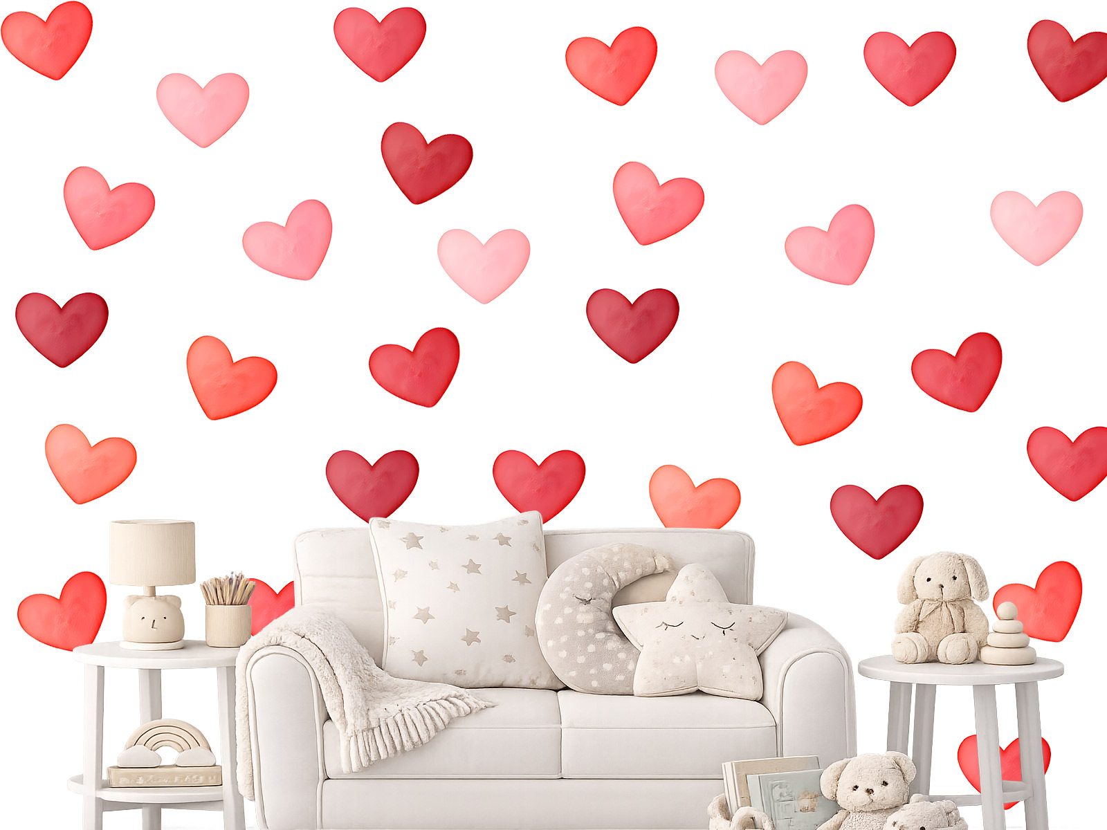 Nálepky na stenu Akvarelové červené srdiečka sú výraznou a romantickou dekoráciou, ktorá interiéru dodá príjemnú a radostnú atmosféru. Kombinácia rôznych odtieňov červenej, od jemnej ružovej až po sýtejšie červené tóny, vytvára krásny akvarelový efekt, vďaka ktorému srdiečka pôsobia jemne a prirodzene, ako keby boli ručne maľované. Tieto nálepky na stenu sú ideálne do detských izieb, ale skvele sa hodia aj ako dekorácia do dievčenských izieb alebo do interiérov, kde chcete vytvoriť hravú a romantickú atmosféru. Červené tóny dodávajú priestoru energiu, teplo a pocit radosti, zároveň však vďaka akvarelovému štýlu nepôsobia príliš výrazne. Nálepky môžete rozmiestniť podľa vlastnej fantázie. Srdiečka môžete rozmiestniť po celej stene, vytvoriť pravidelný vzor alebo len jemnú dekoráciu nad posteľou či v detskom kútiku. Výsledkom je jednoduchá, ale veľmi efektná dekorácia, ktorá premení izbu na útulné miesto plné farieb a pozitívnej energie.