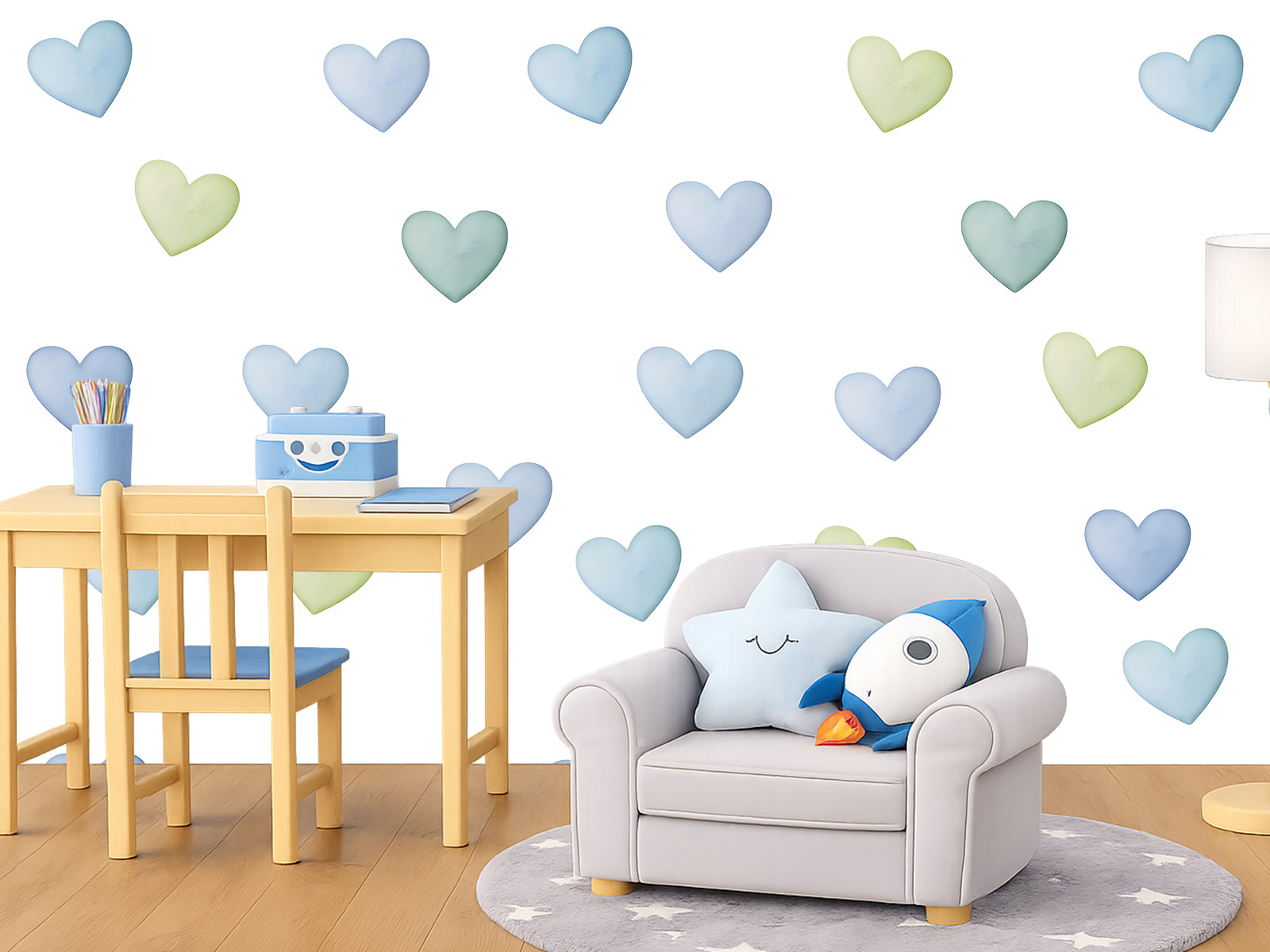 Nálepky na stenu Akvarelové srdiečka pre chlapcov sú jemnou a hravou dekoráciou, ktorá detskej izbe dodá príjemnú a pokojnú atmosféru. Kombinácia modrých, zelených a jemných pastelových odtieňov vytvára harmonickú farebnú paletu inšpirovanú prírodou. Vďaka akvarelovému štýlu majú srdiečka jemné farebné prechody a pôsobia ako ručne maľované. Tieto nálepky na stenu sa skvele hodia do chlapčenských izieb, kde chcete vytvoriť útulné a zároveň hravé prostredie. Jemné farby krásne ladia so svetlým nábytkom, drevenými prvkami aj modernými škandinávskymi interiérmi, takže izba pôsobí harmonicky a prirodzene. Nálepky môžete rozmiestniť podľa vlastnej fantázie. Srdiečka môžete rozmiestniť po celej stene, vytvoriť pravidelný vzor alebo len jemnú dekoráciu nad detskou postieľkou či detskou posteľou. Vďaka tomu ľahko vytvoríte originálnu dekoráciu, ktorá dodá detskej izbe hravý, pokojný a útulný vzhľad.