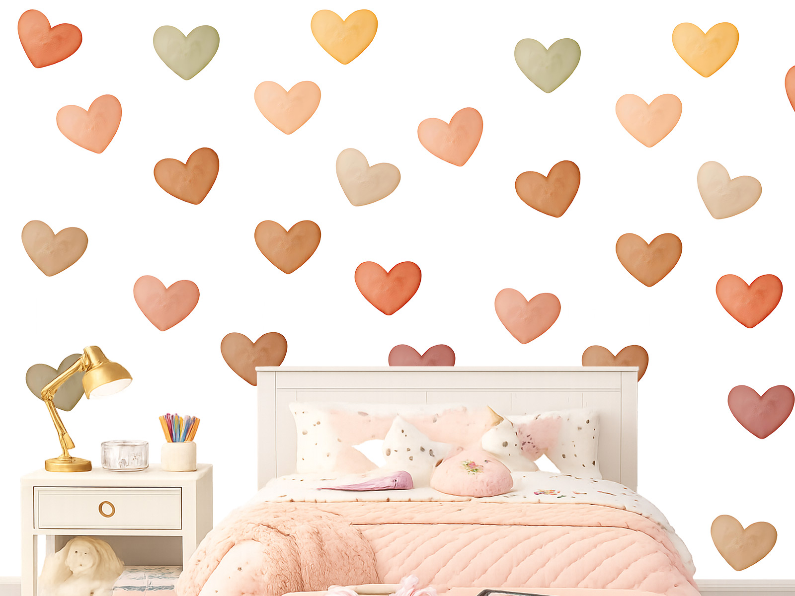 Nálepky na stenu Akvarelové boho srdiečka sú jemnou a štýlovou dekoráciou, ktorá vyniká prirodzenými zemitými odtieňmi inšpirovanými prírodou. Kombinácia teplých tónov béžovej, karamelovej, marhuľovej, jemnej zelenej a tlmenej červenej vytvára harmonický boho štýl, ktorý pôsobí pokojne, útulne a nadčasovo. Vďaka akvarelovému spracovaniu majú srdiečka jemné farebné prechody a jemnú štruktúru, takže pôsobia ako ručne maľované. Dekorácia sa skvele hodí do detských izieb, izieb pre bábätká alebo do interiérov zariadených v prírodnom či škandinávskom štýle. Veľmi dobre doplní drevený nábytok, neutrálne textílie a prírodné dekorácie. Nálepky môžete umiestniť podľa vlastnej fantázie – rovnomerne po celej stene, vytvoriť jemný vzor nad detskou postieľkou alebo vyzdobiť len časť steny. Výsledkom je útulná a harmonická atmosféra, ktorá detskej izbe dodá osobitý a príjemný charakter.