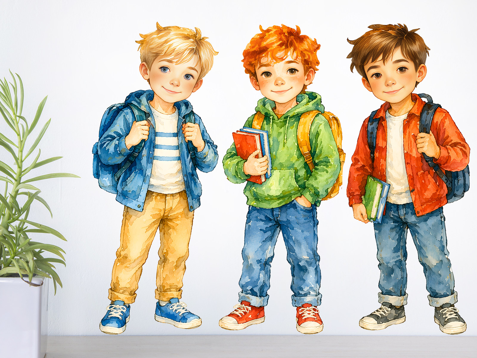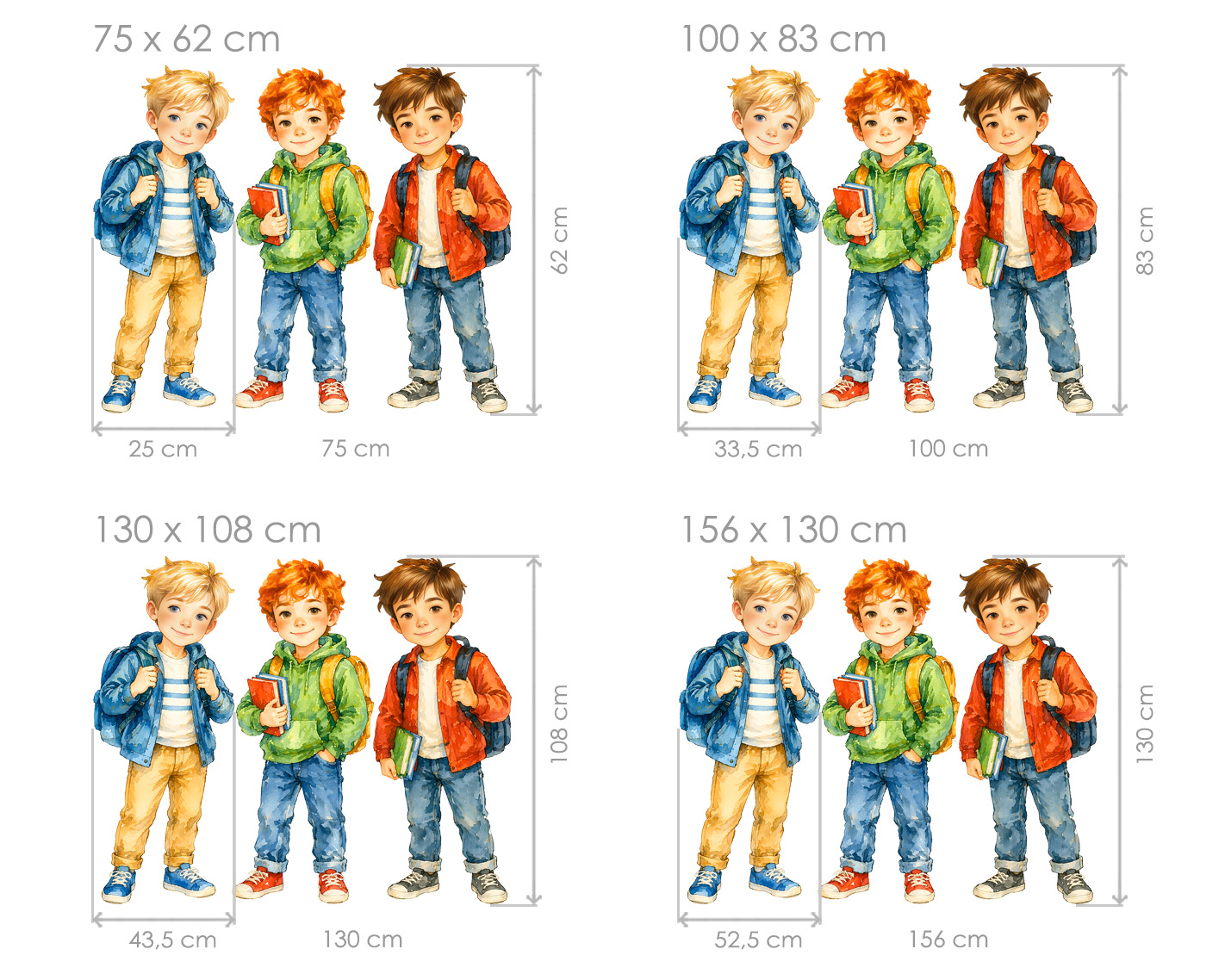 Nálepka na stenu „Školáci v akvareli“ vnáša do detskej izby hravú atmosféru a radosť zo školských dobrodružstiev. Roztomilé postavičky chlapcov s batohmi a knihami pôsobia priateľsky a prirodzene, takže ľahko vytvoria pozitívny vzťah k škole aj k učeniu. Jemné akvarelové spracovanie dodáva ilustráciám mäkkosť a živé farebné prechody. Každý školák má svoj vlastný štýl aj výraz, čo celej kompozícii dodáva dynamiku a pocit skutočného detského sveta. Nálepka je ideálna do detskej izby, pracovného kútika alebo nad písací stôl, kde môže deti motivovať k učeniu aj kreativite. Vďaka samostatným postavičkám je možné rozloženie prispôsobiť podľa priestoru. Perfektná voľba pre všetkých malých školákov, ktorí chcú mať okolo seba inšpiratívny a veselý svet plný poznávania.