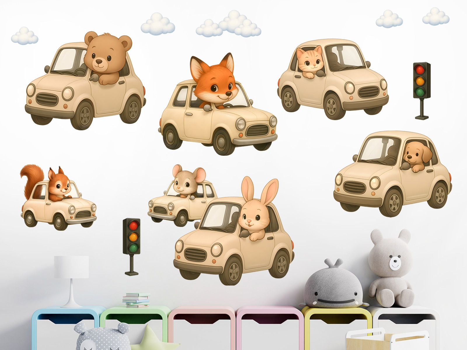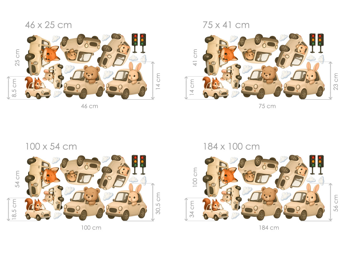 Samolepka na stenu „Autíčka pre deti“ priáší do detského izby roztomilý svet plný pokojneé jízdy, fantázie a priátelských zvígrích kamarádov. Veverička, liška, medvídek, králíček aj myška sa vydávaí na cestu vo svojich béžových autíčkách s guľatými tvarmi, ktoré pôsobí jemne a bezpečne. Každý motív je vytvorený v mäkkom pastelovom štýle, ktorý skvele zapadne do moderních izbíčkov. Tento set je ideální pre deti milující autíčka aj zvírátka a krásne oživí každý izbaíček jemným, hravým a priátelským dizajnom.