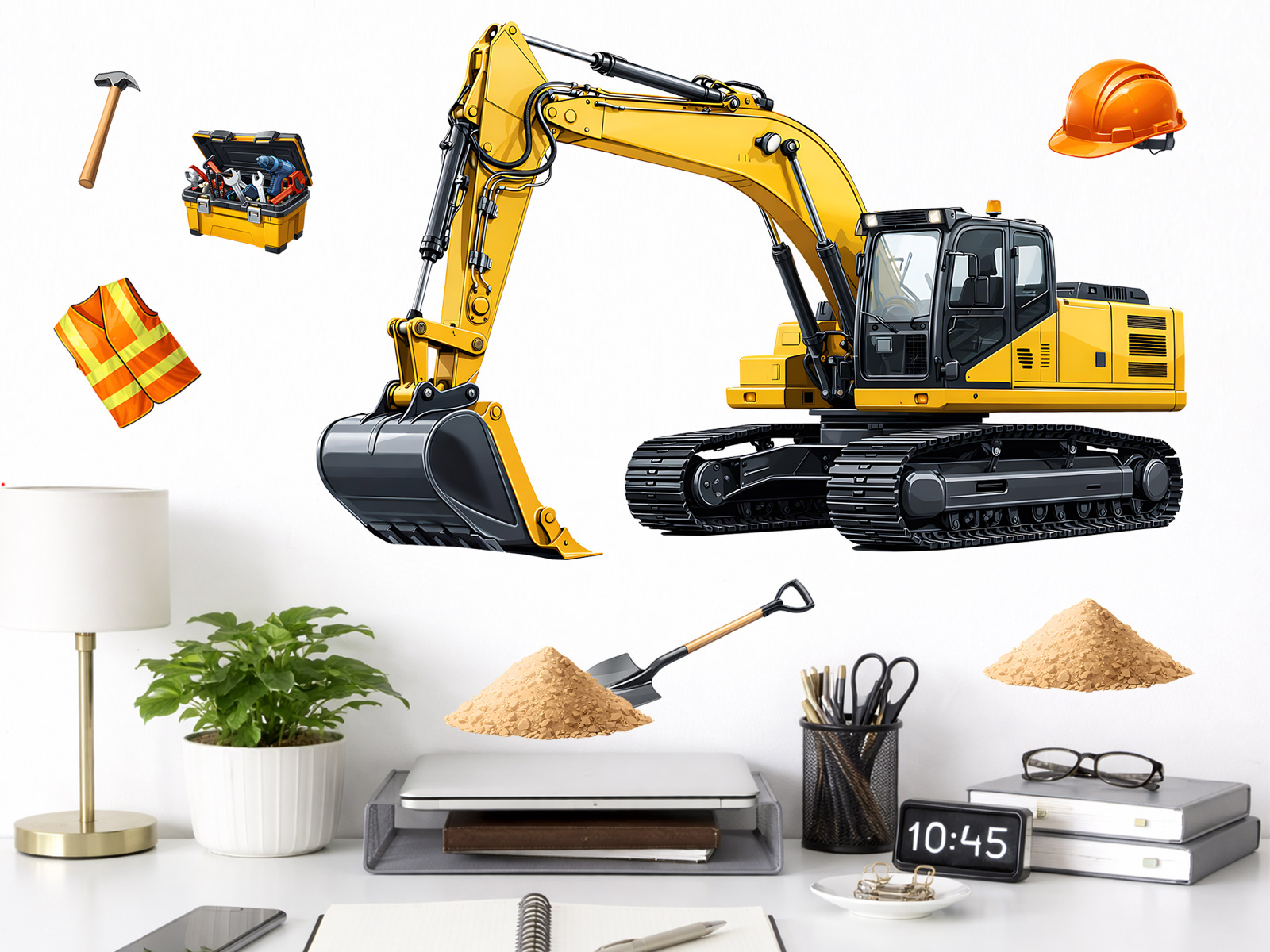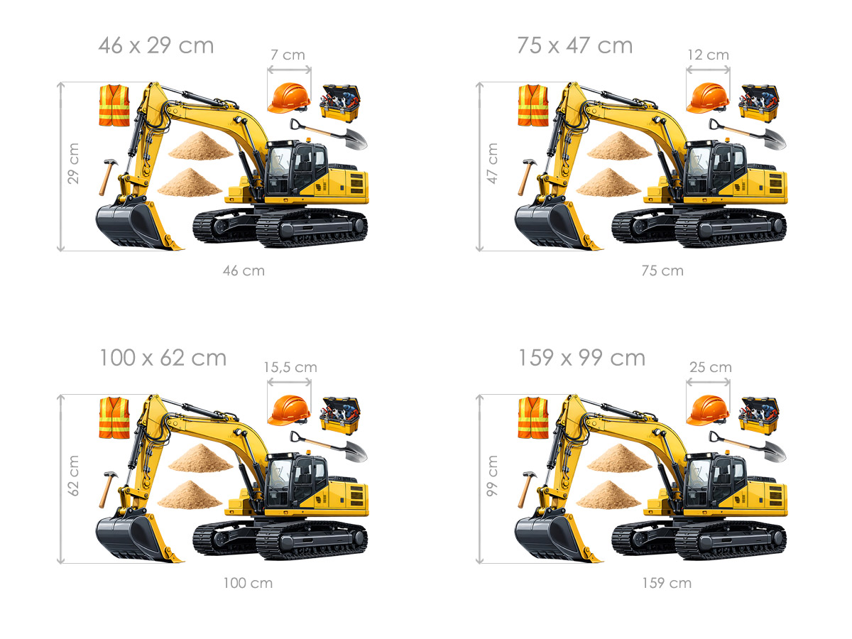 Samolepka na stenu „Bager“ priáší do interiéru výrazný motív stavební techniky v realistickém a detailním spracování, ktoré okamžite zaujme malé aj velké obdivovateľov strojov. Dominantní žltý pásový bager s prepracovanými detailmi ramena, lopaty i kabíny pôsobí silne, dynamicky a vierohodne, ako by bol práve v akcii na staveníšti. Sprievodné motívy v podobe pracovních pomôcok a zhromaždení priírejí scénu a podporují hravú fantáziu detí, ktoré si môžu vytvárať vlastní príbehy zo sveta stavieb a ťažké techniky. Táto samolepka je ideální voľbou pre detský izba, herňu alebo kút určenýý malým stavitelom, kde vytvorí dobrodružnú atmosféru plnú pohybu, práce a objavovania.