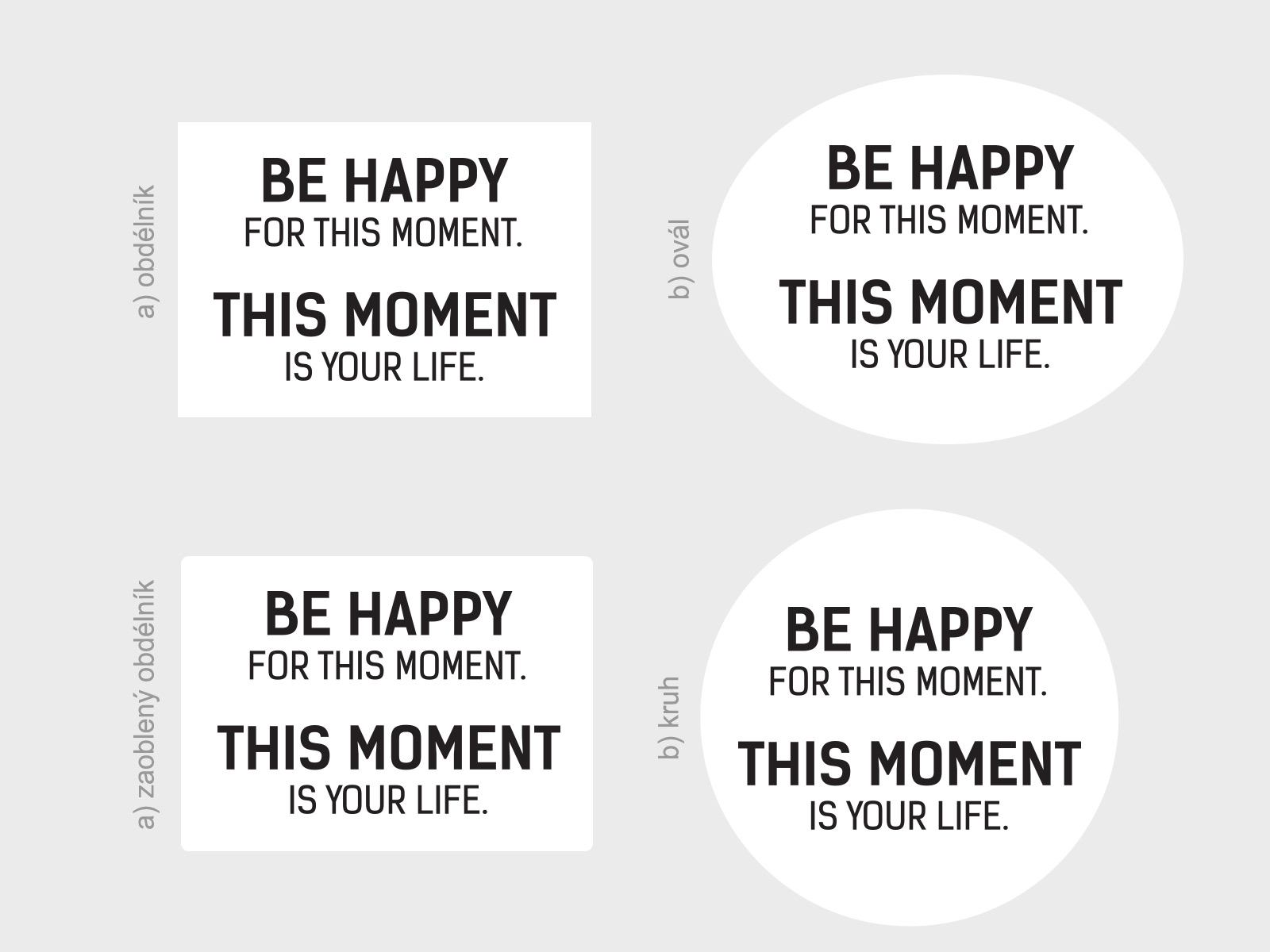 Ak vám nevyhovují preddefinované rozmery, je možné zvoli vlastní rozmer pomocí posuvníku, môžete si také vybrať z cca 50 farieb. Jedná sa o tlač na bielu samolepící vinylovú fóliu s tvarovým orezom. Lepení je jednoduché a bez priehľadné prenosové fólia. Ide o kombináciu bílého pozadí + Vámi vybrané farby. Tvar bílého pozadí je možné zmeniť. Možno vybrať a) obílník, b) ovál, c) zaoblený obdélník, d) kruh viď fotogaléria. Ak teda máte zájem o iný tvar ako na hlavní fotografiu, stačí v posledním kroku objednávky do pola poznámka napísa napr. "obdélník". Dostanete email s potvrdením a finálním náhľadom. Není možné zvoli† farbu textu: bielu 010 alebo jednu z metalickích farieb: 090 striíbrná, 091 zlatá; Ak zvolíte jednu z týchto farieb budete kontaktováni ohľadne zmeny farby alebo zrušení objednávky.