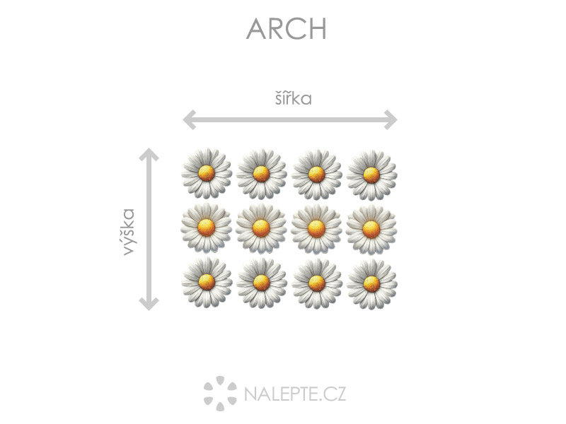 Arch = takto vám bude samolepka doručená. Každý prvok na archu je samostatná samolepka, jednotlivé části jednoduše od papírového podkladu odlepíte a nalepíte na stenu tak, aby zložili výposlední motív podľa Vašich predstáv. Arch si môžte prehliada'a vo fotogalérii. Rozmer archu volíte v objednáke. Prehľad preddefinovaních rozmerov (šírka x výška): - 12 ks 4 x 4 cm - 12 ks 6 x 6 cm - 12 ks 10 x 10 cm - 12 ks 18 x 18 cm - 12 ks 24 x 24 cm Je možné zvoliť aj ľubovoľneý vlastní rozmer hárku pomocí posuvníku alebo klikání na "Vetší", "Menší"
