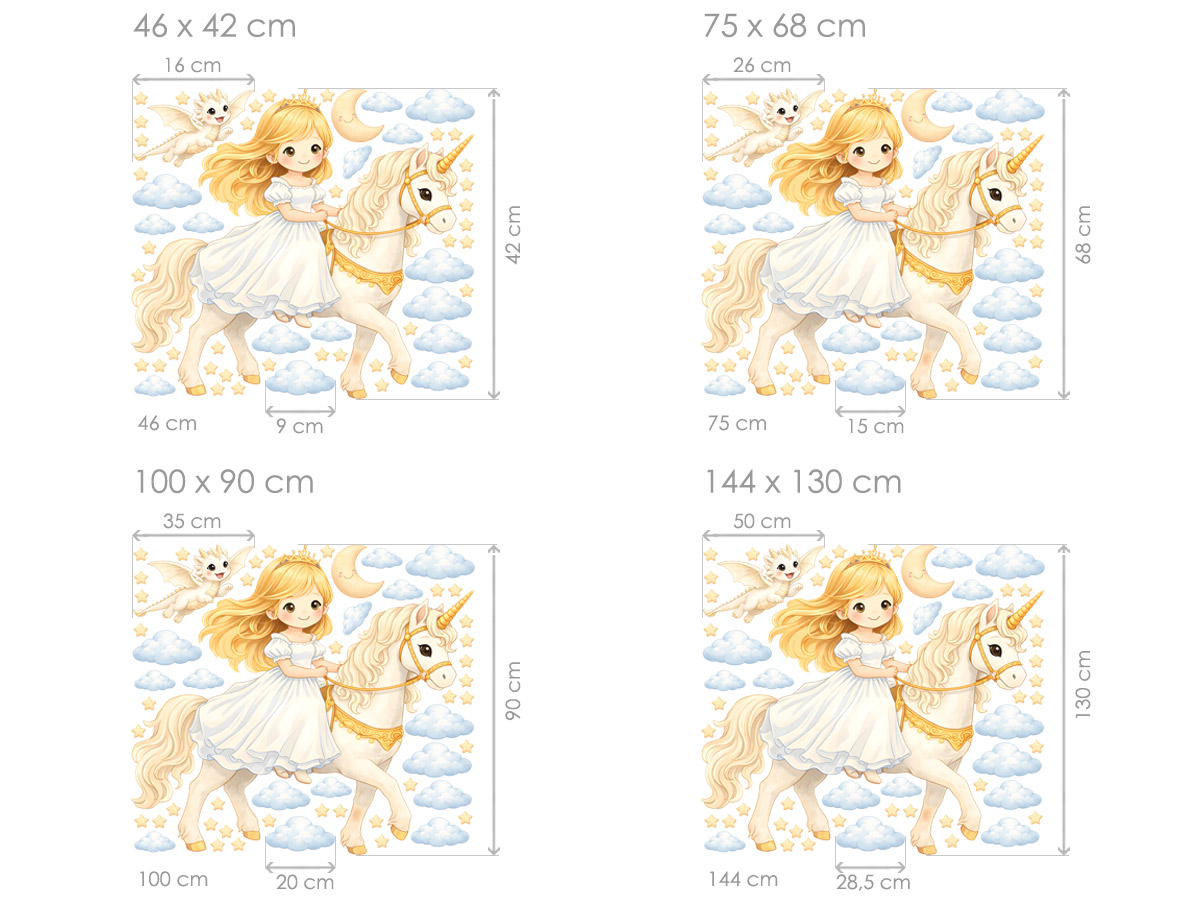 Samolepka na stenu Princezná na jednorožcovi prináša do detskej izby kúzelnú rozprávkovú atmosféru plnú jemnosti a fantázie. Pôvabná princezná s dlhými blond vlasmi sediacimi na elegantnom jednorožcovi pôsobí nežne a pokojne, čím vytvára harmonické prostredie ideálne pre odpočinok aj snívanie. Celý motív dopĺňajú drobné hviezdičky, mráčiky, mesiac a malý dráčik, ktoré spoločne tvoria kúzelnú scénu ako z rozprávky na dobrú noc. Svetlé pastelové odtiene béžovej, krémovej a jemne zlatistej farby dodávajú dekorácii ľahkosť a nadčasovú eleganciu. Vďaka samostatným prvkom si môžete jednotlivé časti rozmiestniť podľa vlastného priestoru a vytvoriť si tak originálnu kompozíciu presne podľa vašich predstáv – nad posteľ, okolo postieľky alebo na celú stenu. Ideálna dekorácia do izbičky malých princezien a milovníčok rozprávkových príbehov.
