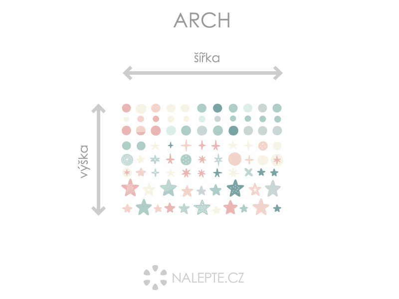 Arch = takto vám bude samolepka doručená. Každý prvok na archu je samostatná samolepka, jednotlivé části jednoduše od papírového podkladu odlepíte a nalepíte na stenu tak, aby zložili výposlední motív podľa Vašich predstáv. Arch si môžte prehliada'a vo fotogalérii. Rozmer archu volíte v objednáke. Prehľad preddefinovaních rozmerov (šírka x výška): a) hárok 47 x 32 cm b) hárok 76 x 52 cm c) hárok 100 x 69 cm d) hárok 130 x 89 cm Je možné zvoliť aj ľubovoľneý vlastní rozmer hárku pomocí posuvníku alebo klikání na "Vetší", "Menší" Arch obsahuje mnoho malých hviezdičiek a bodiek rôznych veľkostí.