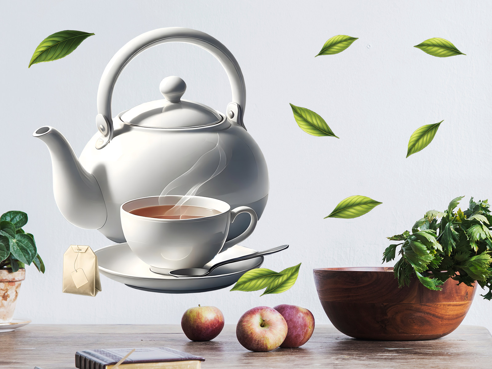 Vychutnajte si pokoj a pohodu šálku čaju každý deň s touto elegantní sadou samolepiek Čajová sada. Jemne realistický motív kanvičky s šálkom horúceho čaju, doplnenýý o čajové lístky a čajový sáček, prinesie do vaší kuchyne alebo jídelne svieží atmosféru a nádych harmónie. Samolepky pôsobí ako malované — mají hladké prechody, decentní lesk a precízne vykreslené detaily, ktoré krásne ladí s moderním aj vidieckymým interiérom. Balení obsahuje:- 1× hlavní motív: čajová kanvica s šálkom- niekoľko samostatných čajových lístkov a čajový sáček pre dotvorení kompozícia