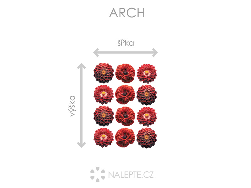 Arch = takto vám bude samolepka doručená. Každý prvok na archu je samostatná samolepka, jednotlivé části jednoduše od papírového podkladu odlepíte a nalepíte na stenu tak, aby zložili výposlední motív podľa Vašich predstáv. Arch si môžte prehliada'a vo fotogalérii. Rozmer archu volíte v objednáke. Prehľad preddefinovaních rozmerov (šírka x výška): a) hárok 15 x 20 cm b) hárok 35 x 47 cm c) hárok 56 x 75 cm d) hárok 74 x 100 cm e) hárok 96 x 130 cm Je možné zvoliť aj ľubovoľneý vlastní rozmer hárku pomocí posuvníku alebo klikání na "Vetší", "Menší"