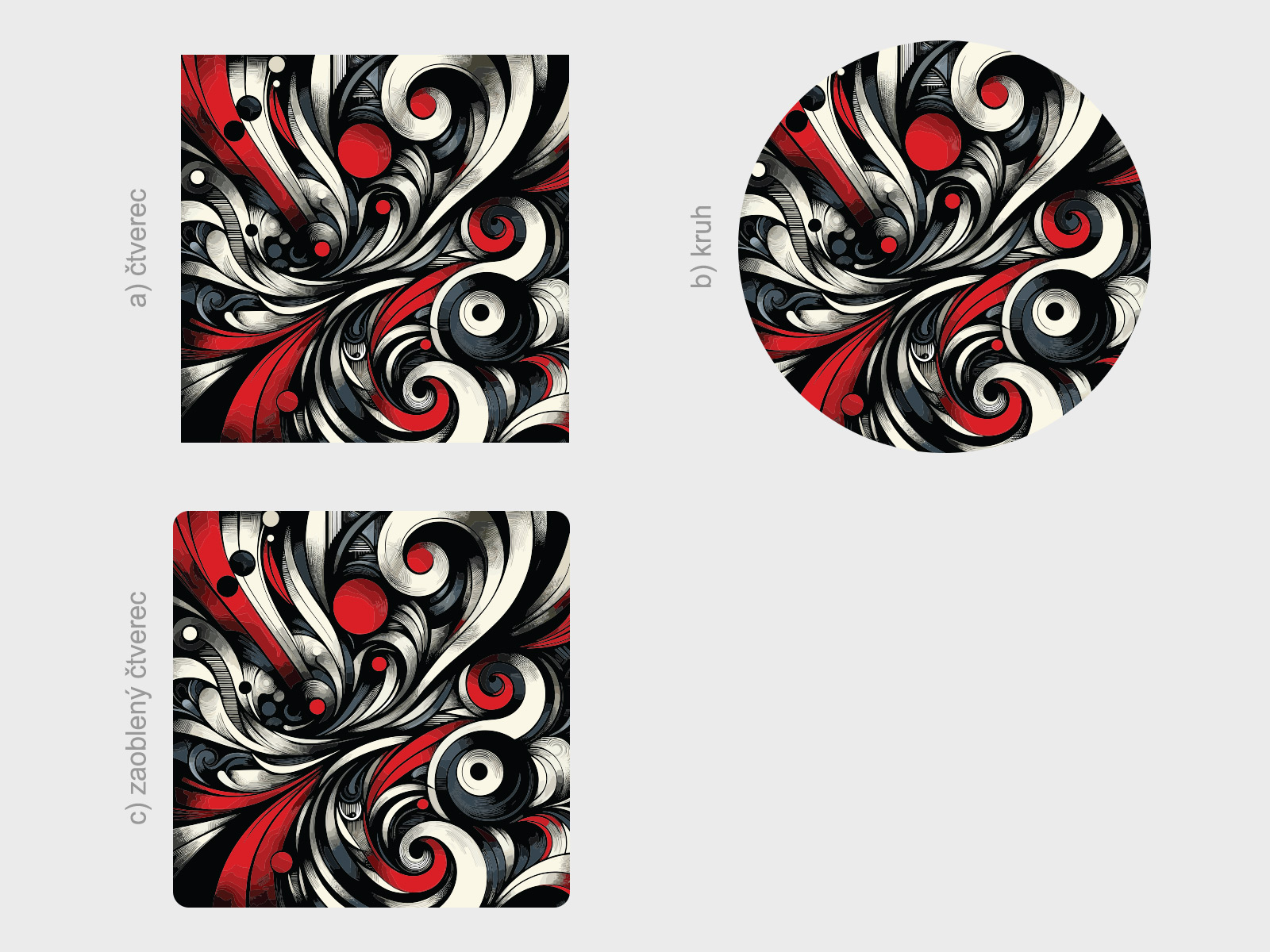 Tvar je možné zmeniť. Možno vybrať a) štvorec, b) kruh, c) zaoblený štvorec viď fotogaléria. Ak teda máte zájem o iný tvar ako na hlavní fotografiu, stačí v posledním kroku objednávky do pola poznámka napísa napr. "kruh". Jedná sa o tištený samolepící plakát - imitácia maľby Je možné zvoliť aj ľubovoľneý vlastní rozmer hárku pomocí posuvníku alebo klikání na "Vetší", "Menší"