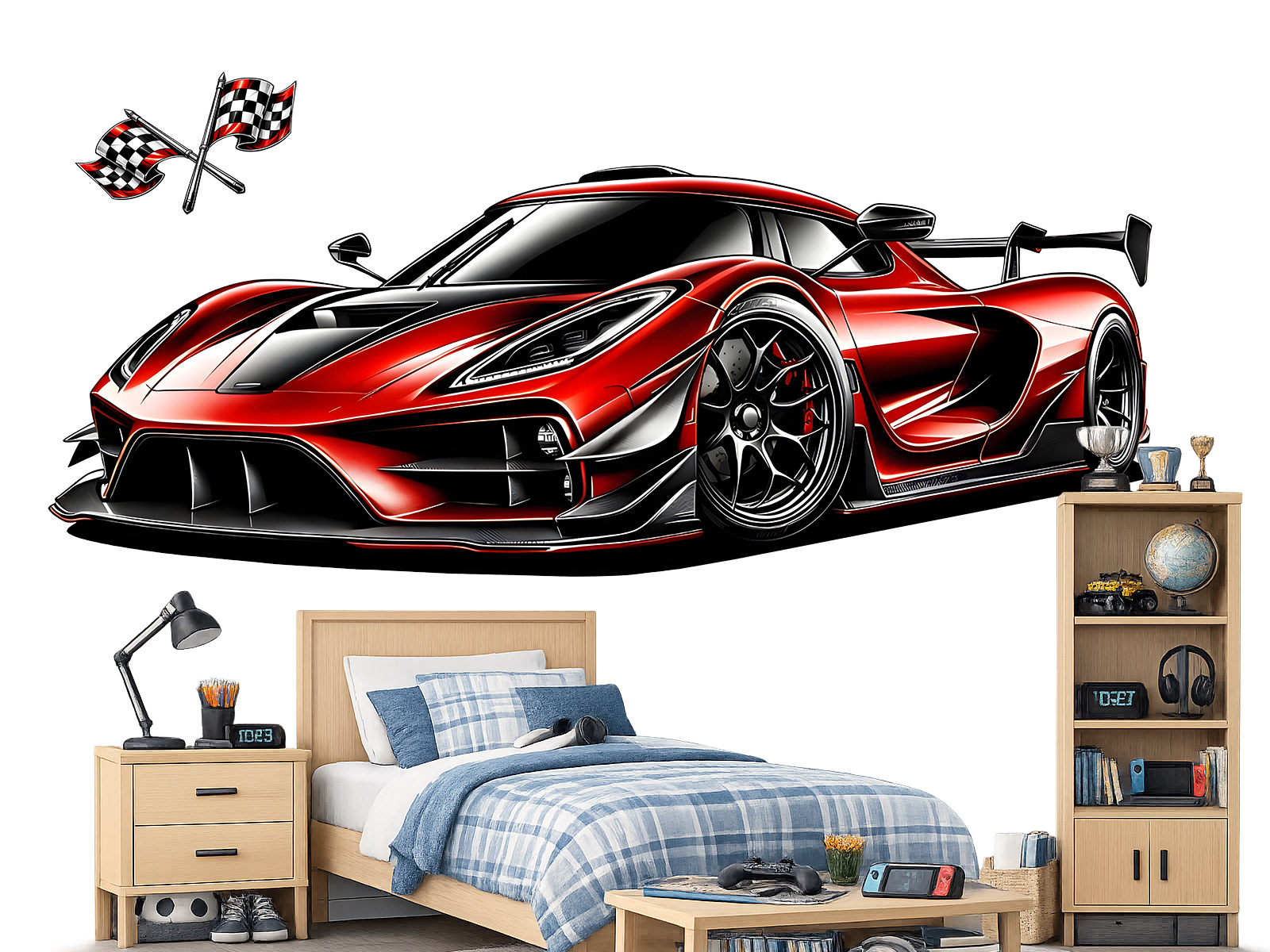 Samolepka na stenu „Červený superšport“ je výrazným dizajnovým prvkom pre všetkych milovníkov rýchlých áut a moderní estetiky. Dynamická ilustrácie športovního vozidla v sýto červeném prevedí s prepracovanými detailmi, ostrými líniami a realistickím vzh&adpadom pôsobí energicky a dodává priestoru pocit rýchlosti, výkonu a luxusu. Skvele sa hodí do detského aj študentského izby, herne, pracovne alebo moderního interiéru, kde sa stane dominantou celé steny. Samolepka pritiahne pozornosť na prví pohľad a premení obyčajný múr v pôsobivú automobilovú scénu, ktorá poteší každého fanúšika superšportov a silných zážitkov.