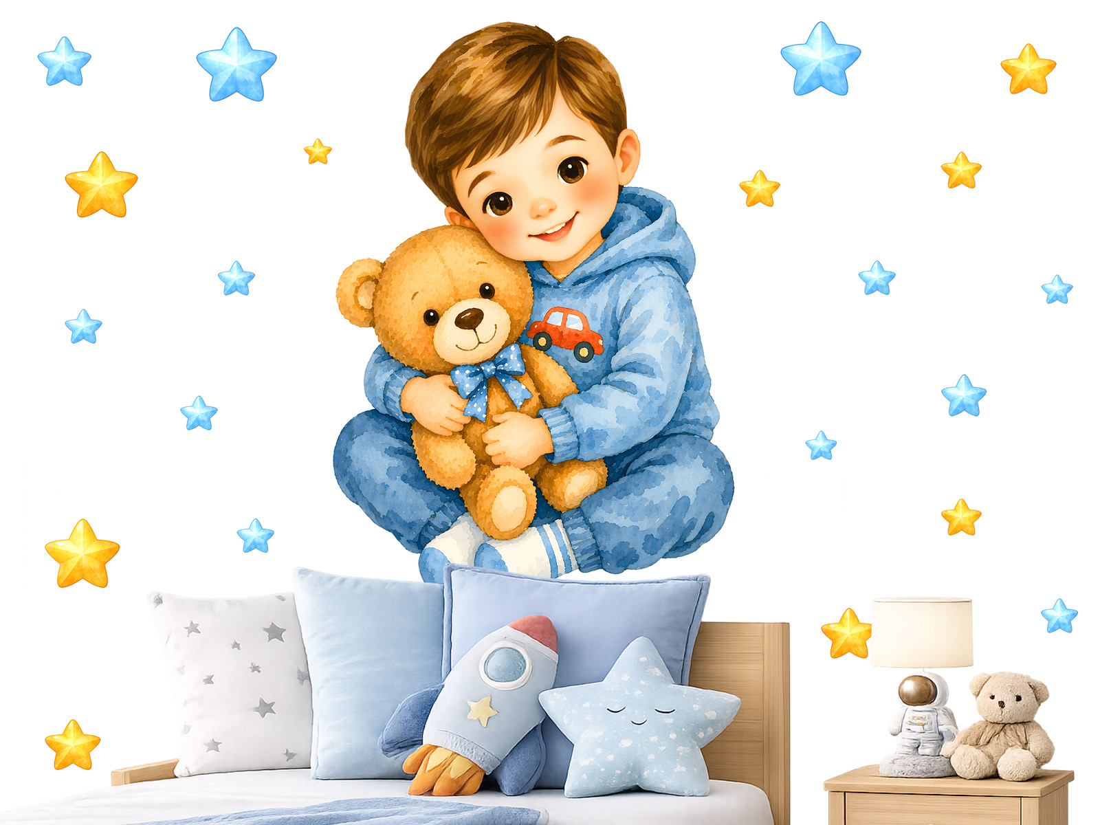Nálepka na stenu „Chlapček a medvedík“ prináša do detskej izby príjemný a upokojujúci motív plný nežnosti. Malý chlapček objímajúci svojho obľúbeného medvedíka pôsobí bezpečne, láskavo a vyvoláva pocit pokoja a pohody. Akvarelové spracovanie dodáva ilustrácii jemnosť a hladké farebné prechody. Kombinácia modrých tónov s teplou farbou medvedíka vytvára harmonický kontrast, ktorý krásne dopĺňajú drobné hviezdičky v pozadí. Motív je ideálny nad detskú postieľku, do spacieho kútika alebo na hlavnú stenu v detskej izbe, kde pomáha vytvoriť príjemnú a pokojnú atmosféru na oddych aj zaspávanie. Perfektná voľba pre malé deti, ktoré milujú plyšových kamarátov a útulné prostredie plné bezpečia.