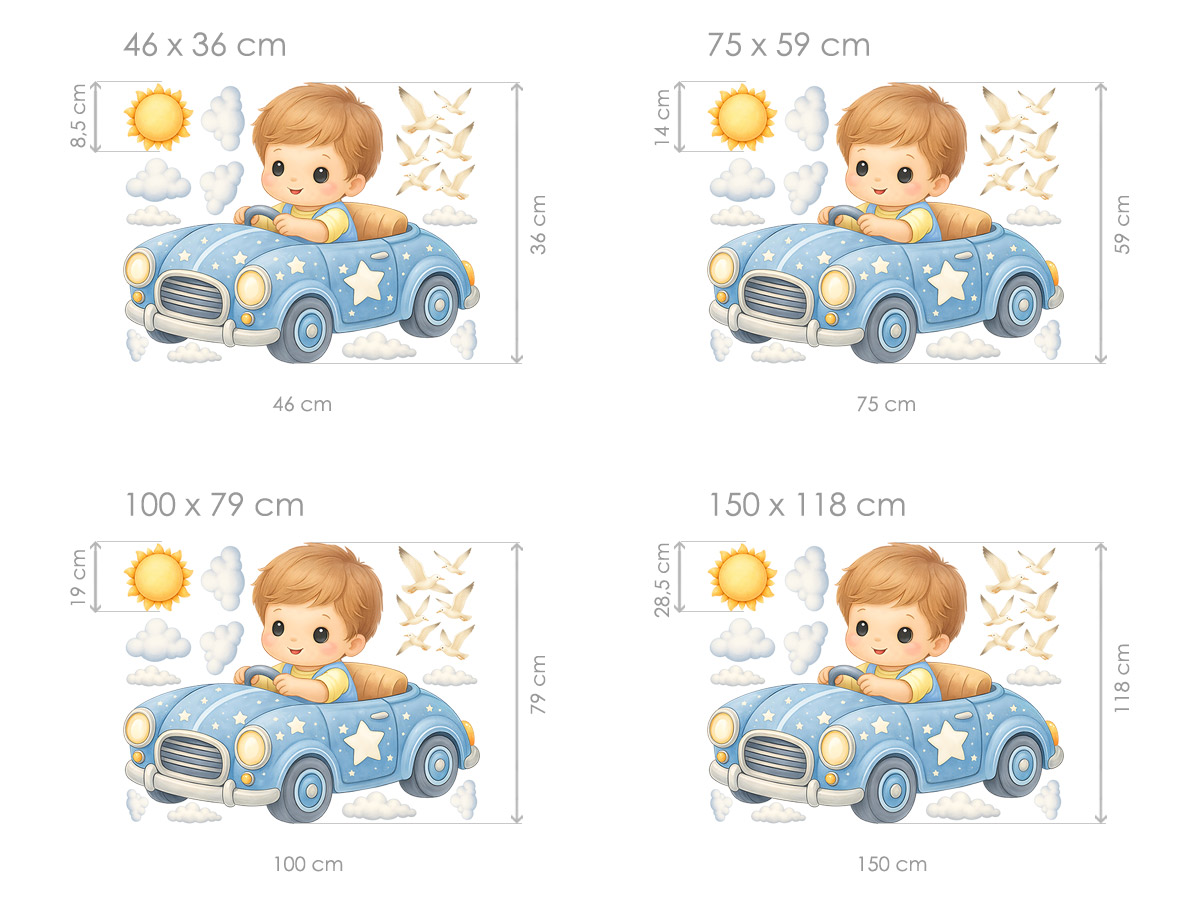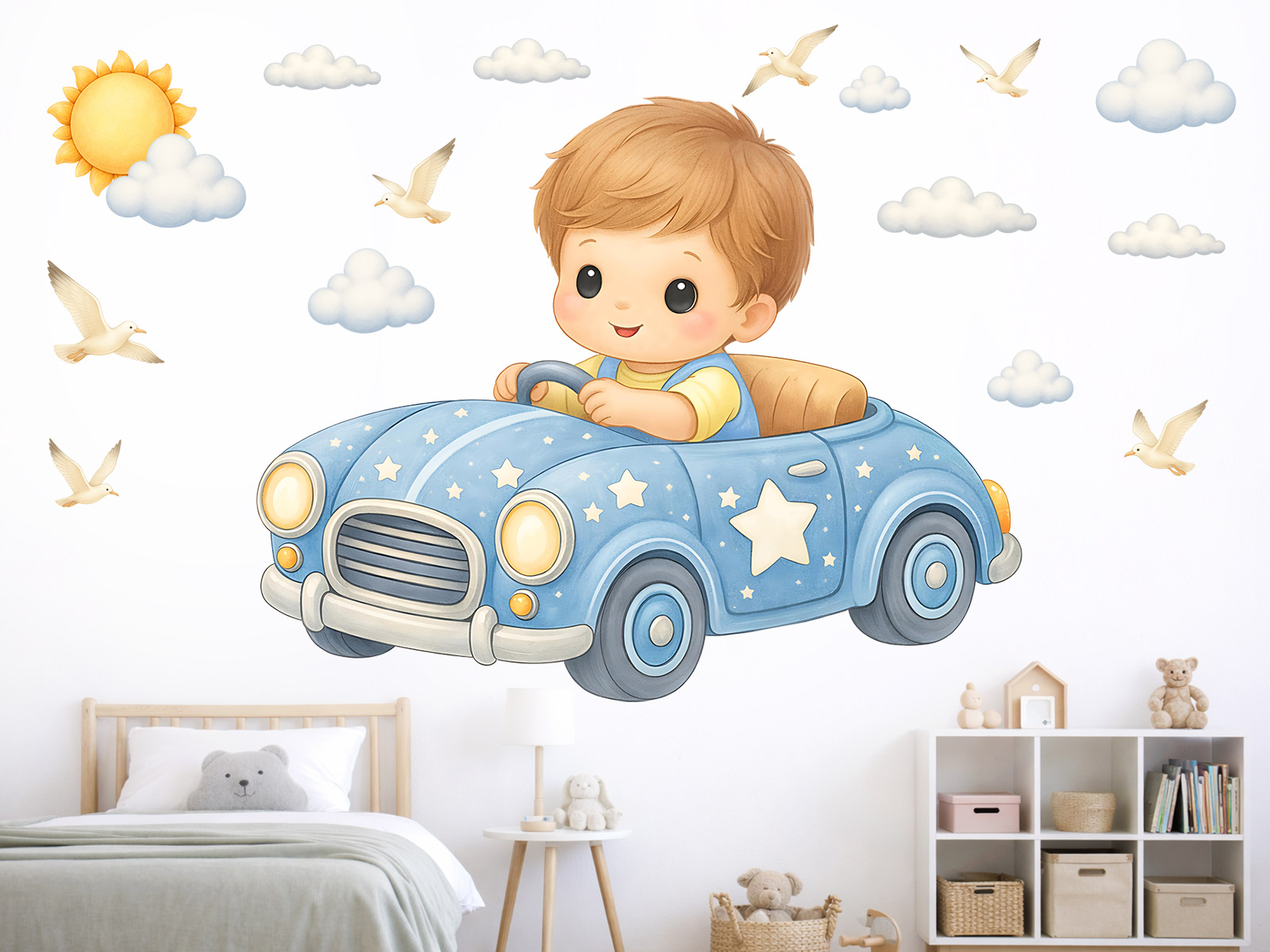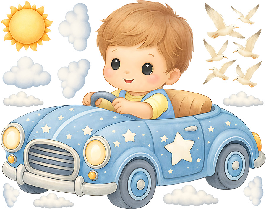 Samolepka na stenu Chlapček v autíčku prenesie detský izba do kúzelného sveta fantázie, radosti a malých dobrodružstieví. Roztomilý chlapček rídící modré autíčko plné hviezdičiek pôsobí hravo, milo a priateľsky, zatímco obláčky, slníčko a poletující ptáčci vytvárají pokojnú a snovú atmosféru. Motív podporuje detskú predstavivosť a prirodzene navodzuje pocit pohody, bezpečí a radostného objavování sveta. Jemné pastelové farby a mäkké tvary sa krásne hodí do izbíčku pre bábätká aj vetší deti a ľahko zapadnú do svetlích, neutrálních aj jemne farebn&´ch interiérov. Zákazník obdrí hárok s hlavním motívom chlapčeka v autíčku doplnený o samostatné dekoratívneí prvky, diíky ktor&mmom je mo|né vytvori† harmonickú kompozíciu presne podπa vlastneí predstavy. Celý dizajn pôsobí nežne, hravo a nadčasovo, a stane sa krásnou dominantou detskej izby.