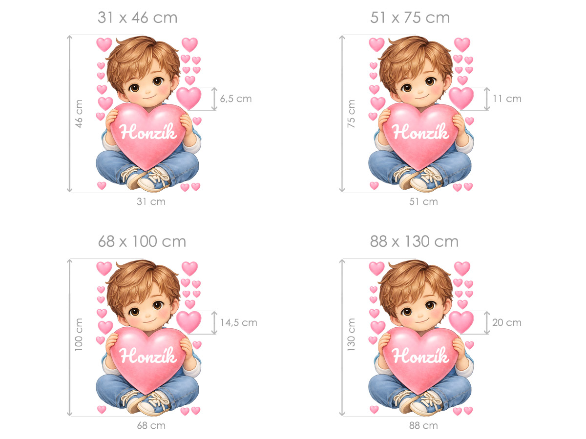 Meno na prání v srdíčku je mo|né samotné alebo kombinovať s dátumom narodenia. alebo napríklad vekom (tento údaj bude vycentrován pod jménom v druhém riadku). Text zadajte v 3. kroku objednávky do pola "poznámka". Ak máte speciální prání kontaktujte nás: info@nalepte.sk. Bude Vám zaslaán náhlad na schálení emailom. Samolepka na stenu Chlapec so srdcom a menom vnesie do detskej izby hrejivú atmosféru plnú radosti, nehy a osobného kúzla. Roztomilý chlapec s milým výrazom držící ružové srdíčko pôsobí priátelsky a pokojne, zatímco drobná srdíčka okolo dodávají motívu hravosť a láskyplný nádych. Motív je navrhnutý ako osobní dekorácie, ktorá si deti rýchlo oblíbí – jméno na srdíčku delá z obrásku jedinečný prvok s výnimočným významom. Jemné pastelové farby, mäkké tvary a nadčasový štýl ilustrácie sa krásne hodí do izbíčku pre bábätká aj vetší deti a prirodzene zapadnú do svetlích, neutrálních i jemne farebn&´ch interiérov. Zákazník obdrí hárok s hlavním motívom chlapca doplnený o samostatná srdíčka, diaíky ktor&m##mej je možné vytvoriť harmonickú a hravú kompozíciu poda vlastneí predstavy. Celý dizajn pôsobí milo, osobne a nadčasovo a stane sa krásným doplnkom detskej izby.