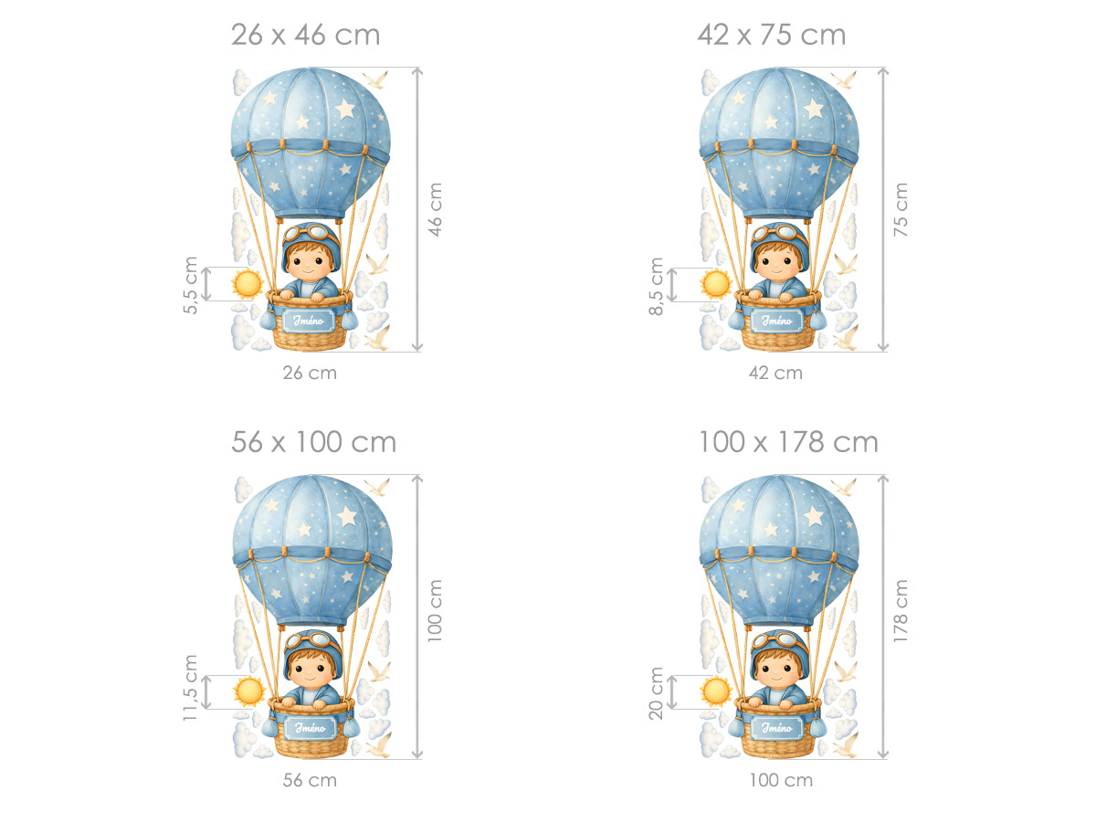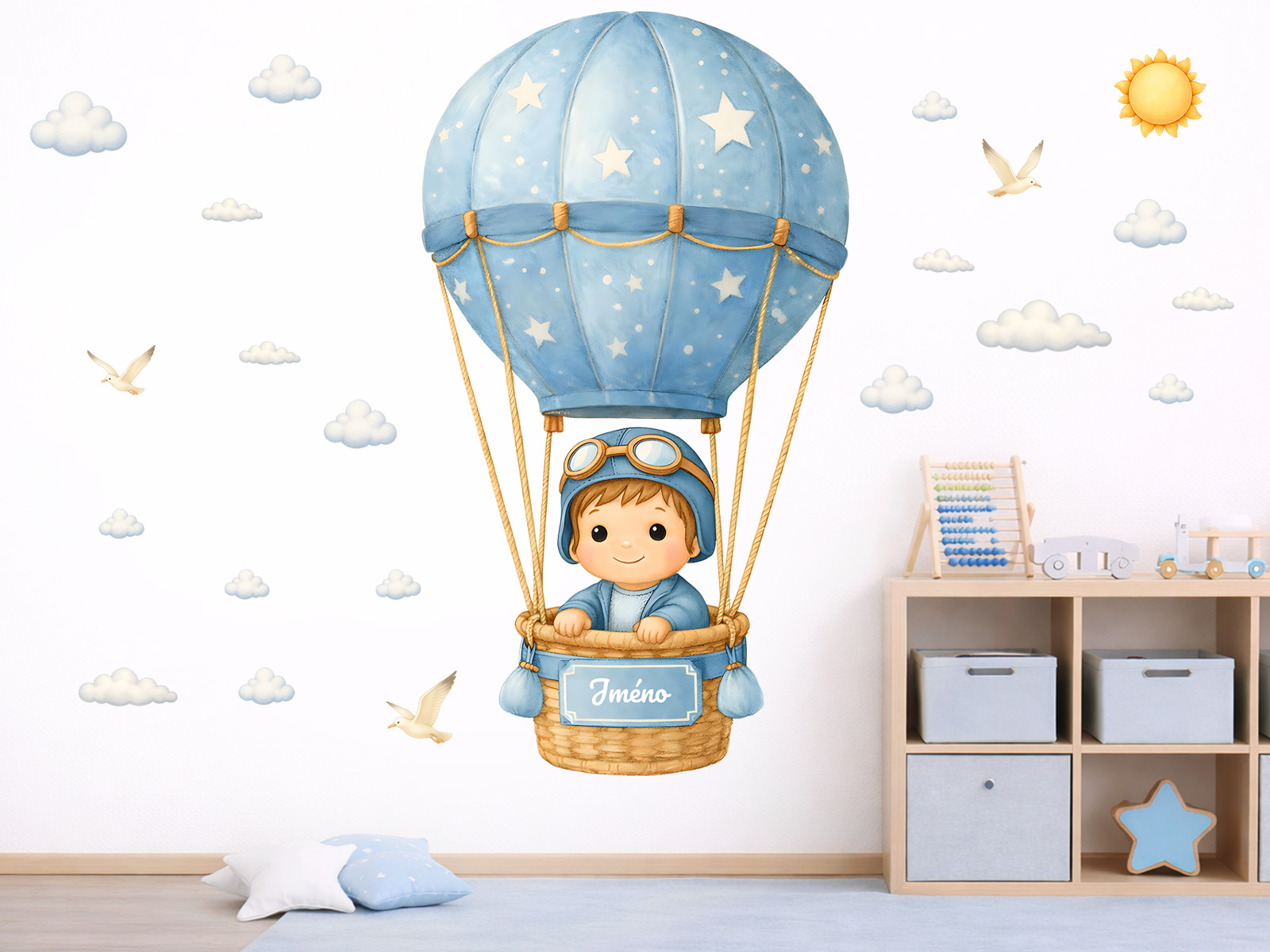 Názov na nápise na koši horúcovzdušného balóna môže mať dĺžku až 12 znakov. Text zadajte v kroku 3 objednávky do poľa „poznámka“. Ak máte akékoľvek špeciálne požiadavky, kontaktujte nás na adrese info@nalepte.cz. Nálepka na stenu „Chlapec v balóne s menom podľa vášho výberu“ prenesie izbu vášho dieťaťa do sveta snov, oblakov a dobrodružných ciest vysoko nad zemou. Roztomilý chlapec v pilotnej čiapke letí v teplovzdušnom balóne zdobenom hviezdami, obklopený mäkkými oblakmi a vtákmi, čím vytvára pokojnú rozprávkovú atmosféru ideálnu pre detský interiér. Možnosť pridať vlastné meno do koša balóna dodáva dekorácii osobný nádych, ktorý poteší deti aj rodičov a krásne zdôrazní jedinečnosť izby. Ilustrácie v jemných pastelových farbách sú nežné, hravé a nadčasové a dajú sa ľahko zladiť s ostatným zariadením detskej izby, čím vytvoria útulné a snové prostredie plné fantázie.