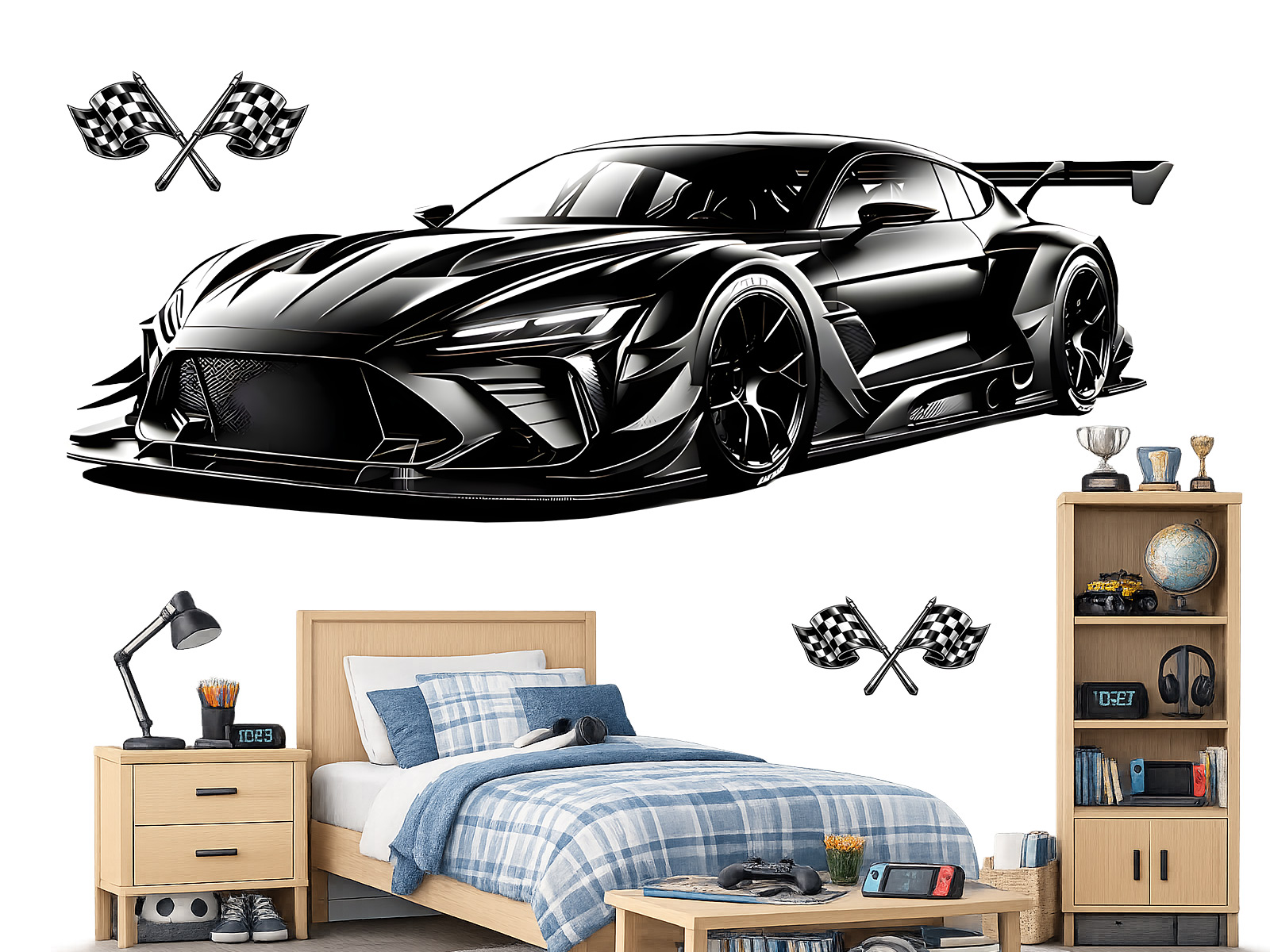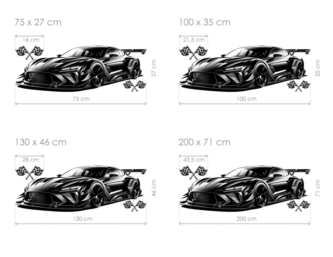 Samolepka na stenu „Čiernyý športák“ priáší do interiéru výraznú dávku elegancie, síly a moderního dizajnu. Dynamický tvar níského športovního vozidla v hlboké černé farbe pôsobí sebavedome, luxusne a zárovne nadčasovo, diíky, čomu sa stane dominantním prvkom každé místnosti. Precízne spracovaé detaily, ostré línie karosérie a agresívneí silueta vytváraírejí realistický dojem rýchlosti a výkonu, ktorý osloví malé aj velké milovníky áut. Samolepka skvele vynikne v detskej izbe, študentskom interiéri i moderním obývacím priestore a dodá múry výrazný charakter. Súčástí balení je hárok s motívom v uvedených rozmeroch, ktorý umožňuje jednoducho zladiť výposledný vzhľad s priestorom a vytvoriť pôsobivú automobilovú dekoráciu.