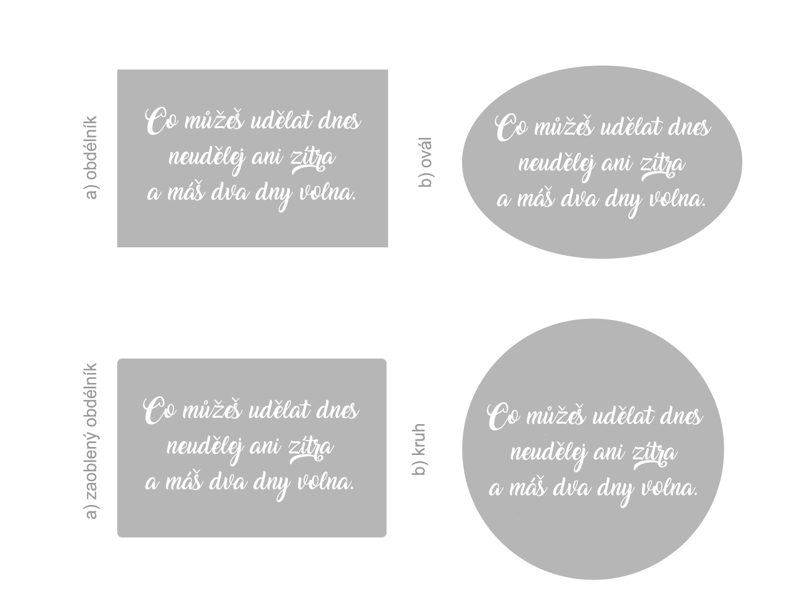 Ak vám nevyhovují preddefinované rozmery, je možné zvoli vlastní rozmer pomocí posuvníku, môžete si také vybrať z cca 50 farieb. Jedná sa o tlač na bielu samolepící vinylovú fóliu s tvarovým orezom. Lepení je jednoduché a bez priehľadné prenosové fólia. Ide o kombináciu pozadí vo vámi vybrané farbe + štandardne bílé farby textu (na prání je možné zmeniť aj farbu textu). Tvar pozadí je možné zmeniť. Možno vybrať a) obílník, b) ovál, c) zaoblený obdélník, d) kruh viď fotogaléria. Ak teda máte zájem o iný tvar ako na hlavní fotografiu, stačí v posledním kroku objednávky do pola poznámka napísa napr. "obdélník". Dostanete email s potvrdením a finálním náhľadom. Není možné zvoli farbu pozadí: bielu 010 (v kombinácii s bílým textom; 090 striíbrná, 091 zlatá, 092 medená. Ak zvolíte jednu z týchto farieb budete kontaktováni ohľadne zmeny farby alebo zrušení objednávky.
