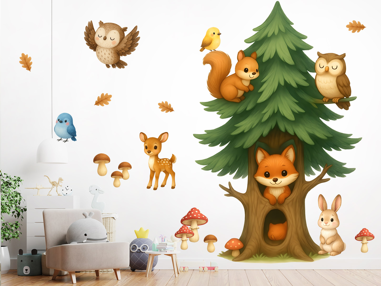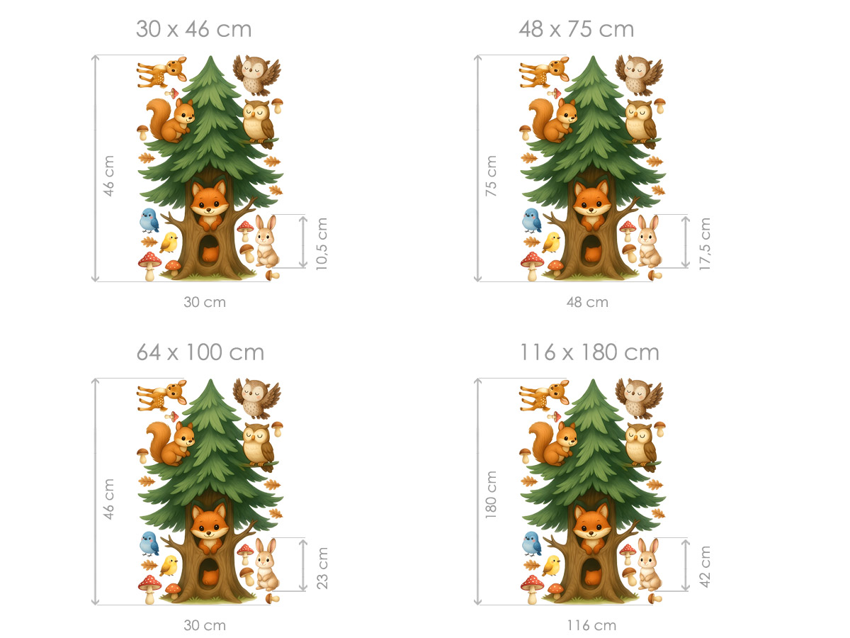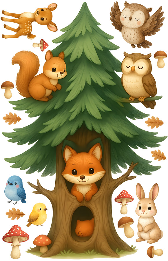 Samolepky na stenu „Detský farebn´ strom“ prinesie do izby vašich deí kúzelnú atmosféru lesa plnú pohody a priátelstva&. Vysoký zelený strom sa stává domovom pre roztomilú lišku, sovičku a veveričku, zatímco okolo poletuje listí a rastú hubky. Jemné farby, priátelské výrazy zvírátok a detailní ilustrácie vytvárajírejí harmonický a hrejivý celok, ktorý krásne zapadne do každého detskej izby. Díky jednoduché aplikáciu je možné motívy ľubovoľne rozmístit pod&aa vlastních predstáv – nad postýlku, do hracího kútika alebo po celé stene. Tento set dodá interiéru hravý, prívetivý nádych a pomôže vytvoriť místo, kde sa deti budú cítiť spokojne av bezpečí.