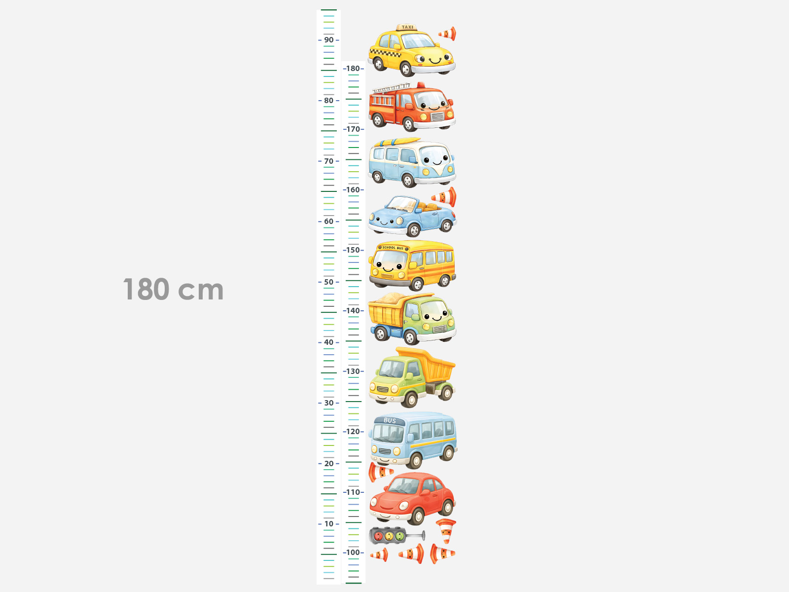 Pripravili sme pre vás detský meter s autíčkami pre deti, pri ktorom si môžete zvoliť výšku od 160 do 180 cm. Prosíme vyberajte len z predvolených rozmerov, nepoužívajte funkciu vlastný rozmer. Bez ohľadu na voľbu veľkosti všetky autíčka sú vždy súčasťou dodaného hárku. Šírka jedného autčíka je cca 14 cm. Výhodou metra je, že lepíte od zeme až do výšky 180 cm. Pruh s metrom je vždy dodávaný v polovici rozrezaný teda na dva kusy, najprv teda nalepíte spodnú časť, potom nadviažete hornou časťou. Každé autíčko je samostatnou samolepkou. Textilný materiál je možné popísať ceruzkou, perom alebo tenkou fixkou, aby ste mohli zaznamenať progres rastu vašich detí. Samolepka na stenu Detský meter autíčka je veselou a hravou dekoráciou, ktorá poteší každého malého milovníka dopravných prostriedkov. Rastový meter uprostred dopĺňa pestrá kolekcia autíčok – od osobných vozidiel cez autobus a taxi až po hasičské auto. Motív je oživený dopravnými kužeľmi a semaforom, ktoré dodávajú celej kompozícii zábavný „cestný“ charakter. Jemné pastelové farby a roztomilé výrazy autíčok pôsobia priateľsky a ideálne zapadnú do detskej izbičky. Meter umožňuje ľahko sledovať, ako dieťa rastie, a premení každé meranie na radostný moment. Vďaka samostatným prvkom si navyše môžete autíčka rozmiestniť presne podľa svojho priestoru. Perfektný doplnok nad posteľ alebo do hracieho kútika pre malých vodičov.
