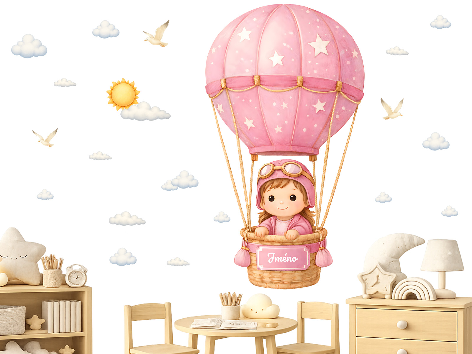 Názov na nápise na koši horúcovzdušného balóna môže mať dĺžku až 12 znakov. Text zadajte v kroku 3 objednávky do poľa „poznámka“. Ak máte akékoľvek špeciálne požiadavky, kontaktujte nás na adrese info@nalepte.cz. Táto jemná a snová nálepka s dievčatkom letiacim v ružovom teplovzdušnom balóne prinesie do detskej izby pocit pokoja, radosti a fantázie. Roztomilú ilustráciu v pastelových farbách je možné personalizovať – do koša balóna môžete pridať meno svojho dieťaťa, čím sa nálepka stane originálnou a osobnou dekoráciou. Nálepka je ideálna nad detskú postieľku, detskú posteľ alebo detský kútik a je vhodná najmä do dievčenských izieb. Vysokokvalitná tlač, jemný akvarelový štýl a jednoduchá aplikácia bez bubliniek zaručujú, že premení každý priestor na magické miesto plné snov a dobrodružstiev.