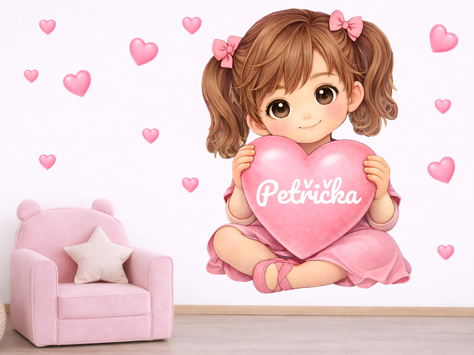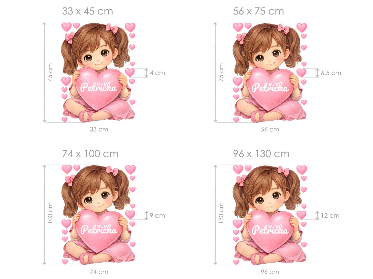 Meno na prání v srdíčku je mo|né samotné alebo kombinovať s dátumom narodenia. alebo napríklad vekom (tento údaj bude vycentrován pod jménom v druhém riadku). Text zadajte v 3. kroku objednávky do pola "poznámka". Ak máte speciální prání kontaktujte nás: info@nalepte.sk. Bude Vám zaslaán náhlad na schálení emailom. Samolepka na stenu Blond dievčatko so srdcom a menom vytvorí v detskej izbe jemnú, láskyplnú atmosféru plnú radosti a osobního kúzla. Roztomilá dievčatko s vrkočmi a mašličkami vo vlasoch držící ružové srdíčko pôsobí milo, pokojne a priateľsky, zatímco drobná srdíčka okolo dodávají motívu hravosť a nežný nádych. Motív je navrhnutý ako osobní dekorácia, ktorú si deti ľahko zamilují – jméno na srdíčku delá z obrásku jedinečný prvok s výnimočným významom. Jemné pastelové farby, mäkké tvary a láskavý výraz dievčatká sa krásne hodí do izbíčku pre bábätká aj vetší deti a prirodzene zapadnú do ružovo, neutrálne i pohádkovo lade&´ch interiérov. Zákazník obdrí hárok s hlavním motívom dievčatka doplnený o samostatná srdíčka, diaíky ktor&m##mej je možné vytvoriť harmonickú a hravú kompozíciu poda vlastneí predstavy. Celý dizajn pôsobí nežne, elegantne a nadčasovo a stane sa krásným osobním doplnkom detskej izby.