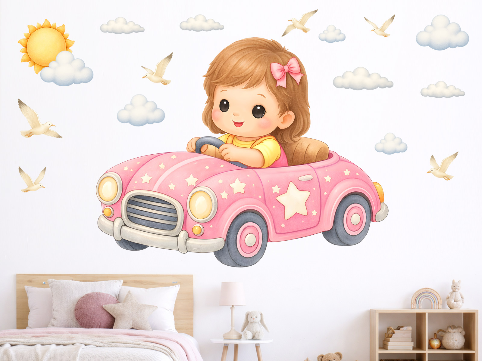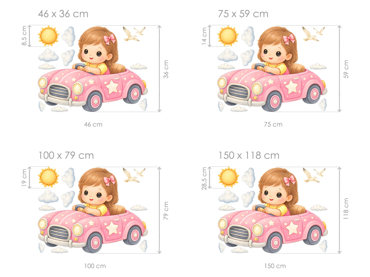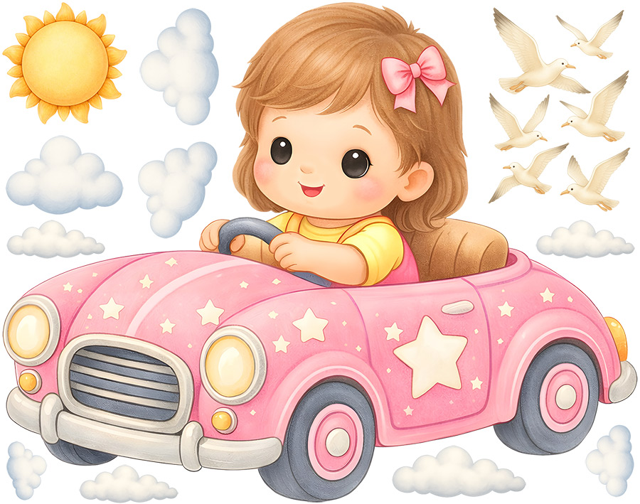 Samolepka na stenu Dievčatko v autíčku vnesie do detskej izby kúzelnú atmosféru plnú nehy, radosti a fantázie. Roztomilá dievčatko idúí v ružovém autíčku pôsobí milo a hravo, zatímco obláčky, slníčko a poletující ptáčci dotvárejí pocit pokoja a snového sveta. Motív podporuje detskú predstavivosť a prirodzene navodzuje pocit pohody, bezpečí a radostného objavování, ako by sa každý deň vydávala na malé dobrodružstvoí. Jemné pastelové farby a mäkké tvary krásne zapadnú do izbyíčku pre bábätká aj vetší deti a ľahko sa sladí so svetlými, neutrálními aj ružovo lade&´mi interiérmi. Zákazník obdrí hárok s hlavním motívom dievčatka v autíčku doplnený o samostatné dekoratívneí prvky, diíky ktor&m#3;ou je možné vytvoriť harmonickú kompozíciu poda vlastneí predstavy. Celý dizajn pôsobí jemne, hravo a nadčasovo a stane sa nežnou dominantou detskej izby.