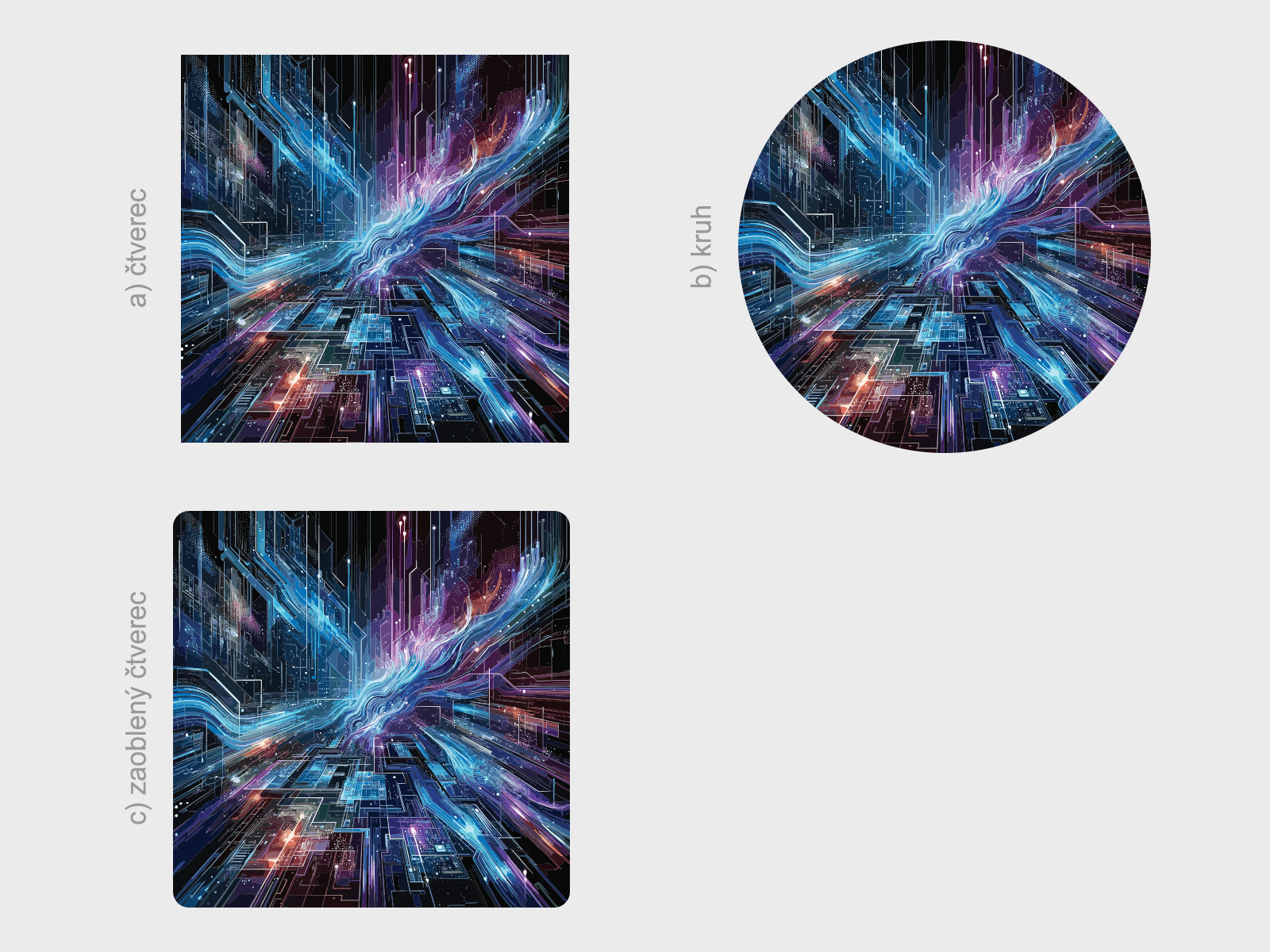 Tvar je možné zmeniť. Možno vybrať a) štvorec, b) kruh, c) zaoblený štvorec viď fotogaléria. Ak teda máte zájem o iný tvar ako na hlavní fotografiu, stačí v posledním kroku objednávky do pola poznámka napísa napr. "štvorec". Jedná sa o tištený samolepící plakát - imitácia maľby Je možné zvoliť aj ľubovoľneý vlastní rozmer hárku pomocí posuvníku alebo klikání na "Vetší", "Menší"