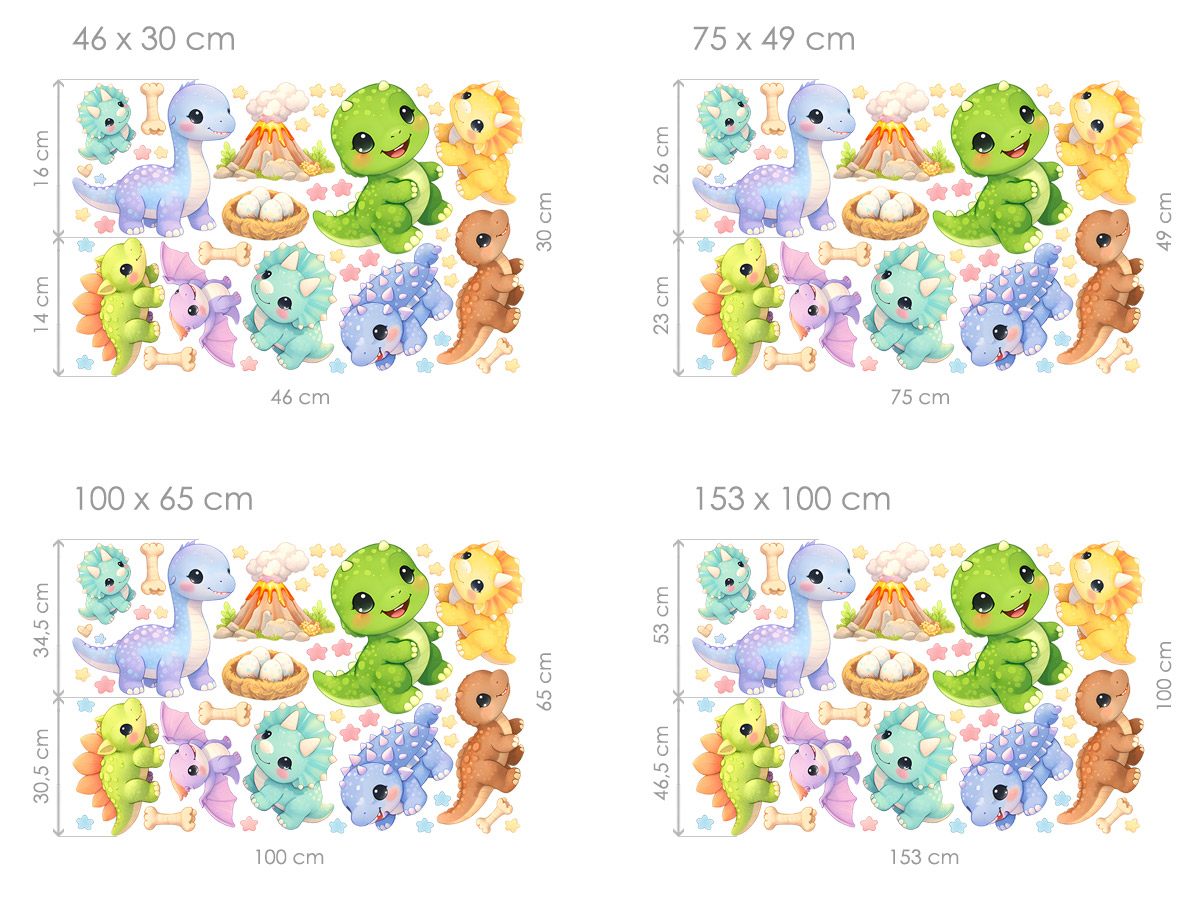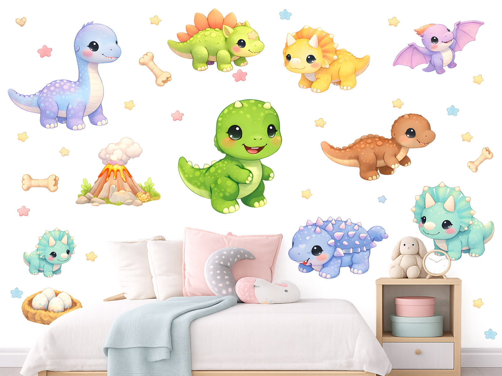 Nálepky na stenu „Dinosaurusíci“ prinášajú do detskej izby veselý a hravý svet plný roztomilých pravekých kamarátov. Farebné dinosaury v jemnom detskom štýle pôsobia priateľsky a vyčaria úsmev na tvári každého malého dobrodruha. Motív dopĺňajú hviezdičky, kosti, vajíčka a malá sopka, ktoré spolu vytvárajú zábavnú a živú scénu. Vďaka pastelovým farbám celok nepôsobí rušivo, ale naopak príjemne dotvorí detský interiér. Táto dekorácia je ideálna do izbičky pre menšie deti, ktoré milujú dinosaury, ale v roztomilejšej podobe. Skvele sa hodí nad posteľ, do herného kútika alebo na väčšiu voľnú stenu, kde vytvorí veselú a hravú atmosféru.