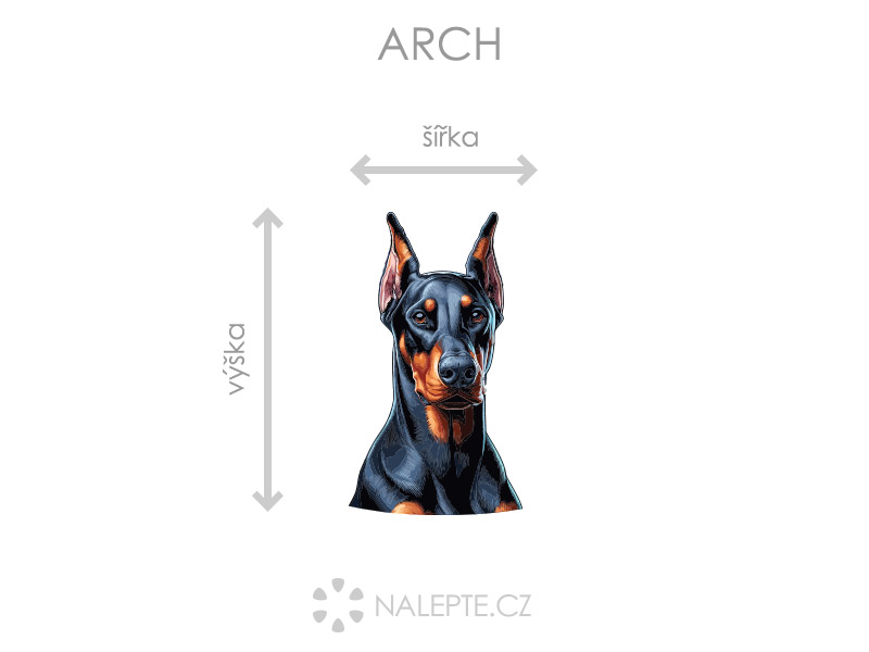Arch = Arch si môžete prehliadnuť vo fotogalérii. Rozmer archu volíte v objednáke. Prehľad preddefinovaních rozmerov (šírka x výška): a) hárok 11 x 20 cm b) hárok 27 x 47 cm c) hárok 43 x 75 cm d) hárok 57 x 100 cm e) hárok 75 x 130 cm Je možné zvoliť aj ľubovoľneý vlastní rozmer hárku pomocí posuvníku alebo klikání na "Vetší", "Menší" Chovateľov dobermanov (Dobermann) určite ocení túto samolepku na stenu, ktorou je možné vyrobiť v ľubovoľneé veľkosti aj zrkadlovo otočiť. Je možné vybrať si aj samolepky iných rás z naší ponuky ídky.