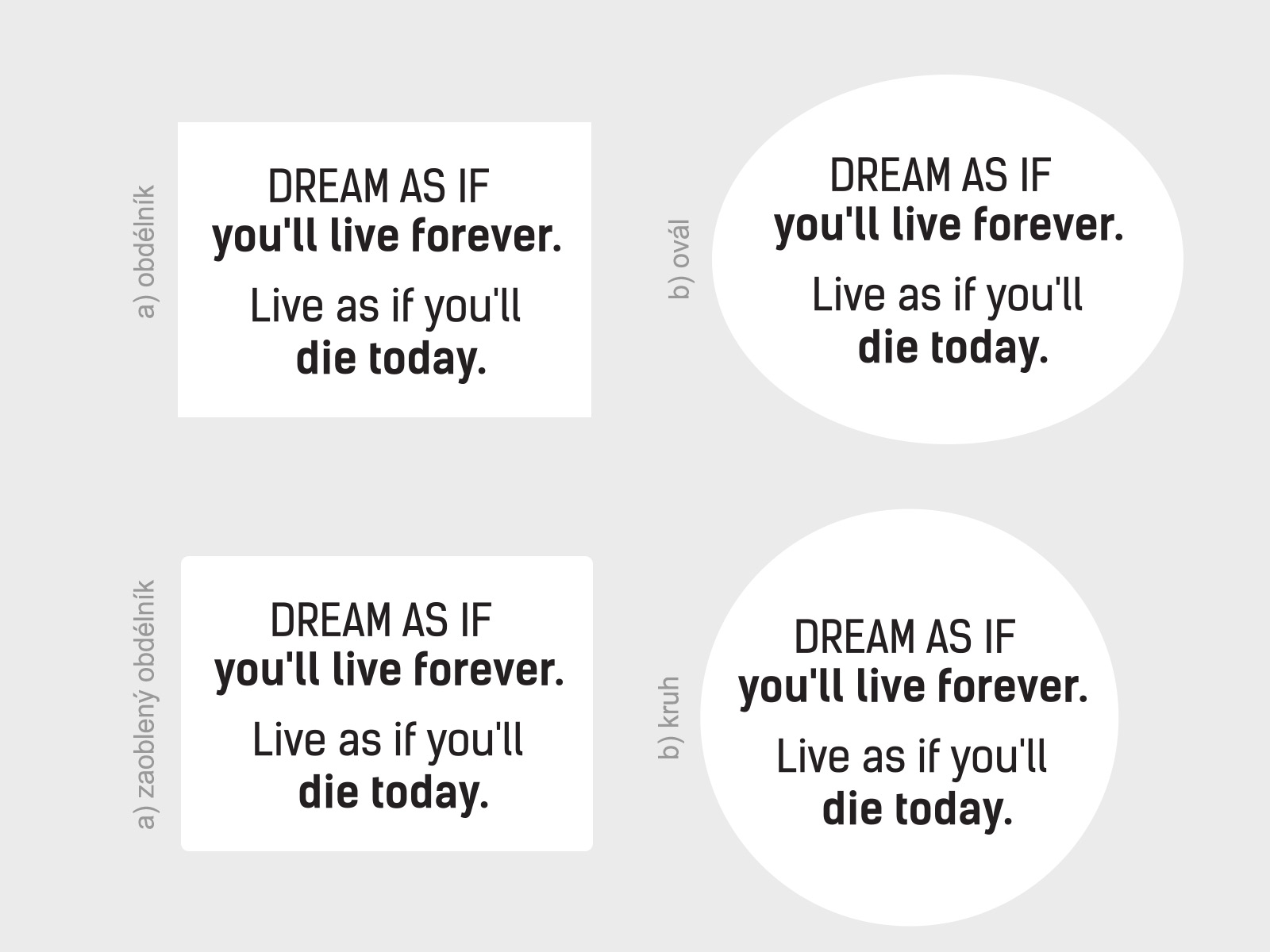 Ak vám nevyhovují preddefinované rozmery, je možné zvoli vlastní rozmer pomocí posuvníku, môžete si také vybrať z cca 50 farieb. Jedná sa o tlač na bielu samolepící vinylovú fóliu s tvarovým orezom. Lepení je jednoduché a bez priehľadné prenosové fólia. Ide o kombináciu bílého pozadí + Vámi vybrané farby. Tvar bílého pozadí je možné zmeniť. Možno vybrať a) obílník, b) ovál, c) zaoblený obdélník, d) kruh viď fotogaléria. Ak teda máte zájem o iný tvar ako na hlavní fotografiu, stačí v posledním kroku objednávky do pola poznámka napísa napr. "obdélník". Dostanete email s potvrdením a finálním náhľadom. Není možné zvoli† farbu textu: bielu 010 alebo jednu z metalickích farieb: 090 striíbrná, 091 zlatá; Ak zvolíte jednu z týchto farieb budete kontaktováni ohľadne zmeny farby alebo zrušení objednávky. Sníva, ako by si mal žít navždy. Ži, ako by si mal zomrít dnes. Èo k tomuto inšpiratívnemu naápisu na stenu doda?. Nalepte si ho do svého interiéru alebo ho darujte ako dárok. Zvoľte si svoju farbu aj veľkosť.