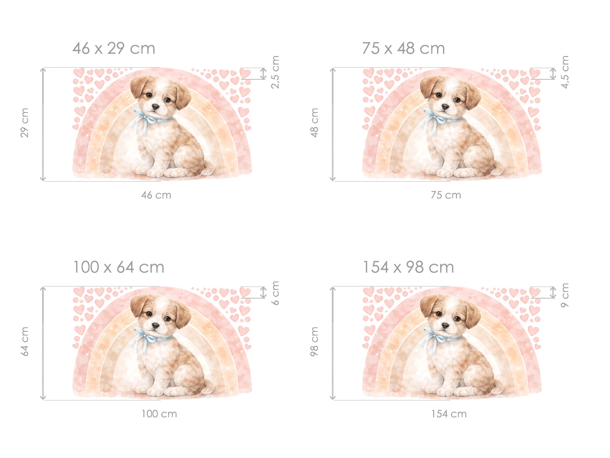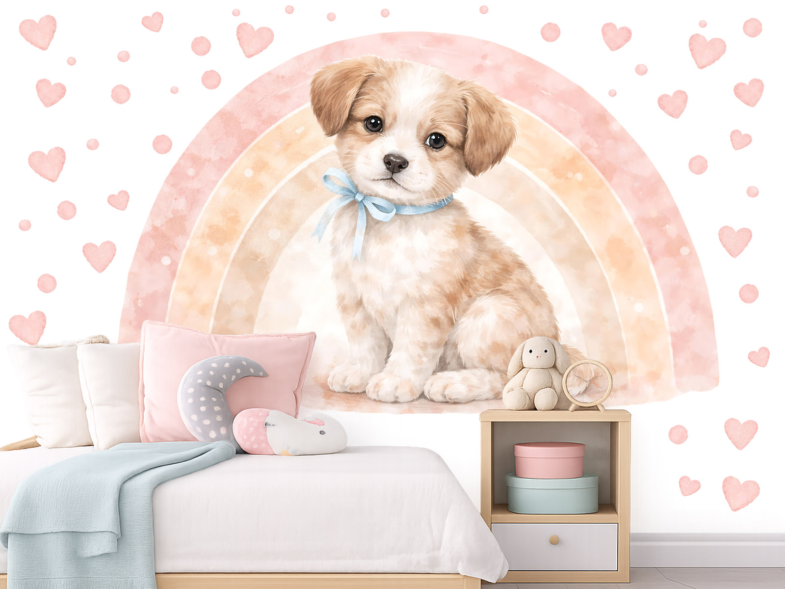 Nálepka na stenu „Dúha a psík“ vnesie do detskej izby jemnú rozprávkovú atmosféru plnú pokoja, radosti a nežných emócií. Roztomilé šteniatko s jemným výrazom je umiestnené na pastelovej dúhe v ružových a broskyňových odtieňoch, doplnené malými srdiečkami, ktoré pôsobivo zjemňujú celý motív a dodávajú mu láskyplný charakter. Ilustrácia je vykreslená v akvarelovom štýle s jemnými prechodmi a svetlými farbami, vďaka čomu sa perfektne hodí do dievčenskej izby, detského kútika alebo relaxačnej zóny pre najmenšie deti. Motív pôsobí teplým, útulným dojmom a ľahko sa stáva dominantným prvkom priestoru, ktorý podporuje pocit bezpečia a pohody. Oblúk obsahuje jednotlivé prvky v prehľadnom usporiadaní a je k dispozícii v niekoľkých veľkostiach, takže si môžete ľahko vybrať variantu, ktorá zodpovedá veľkosti steny a celkovému dizajnu interiéru.