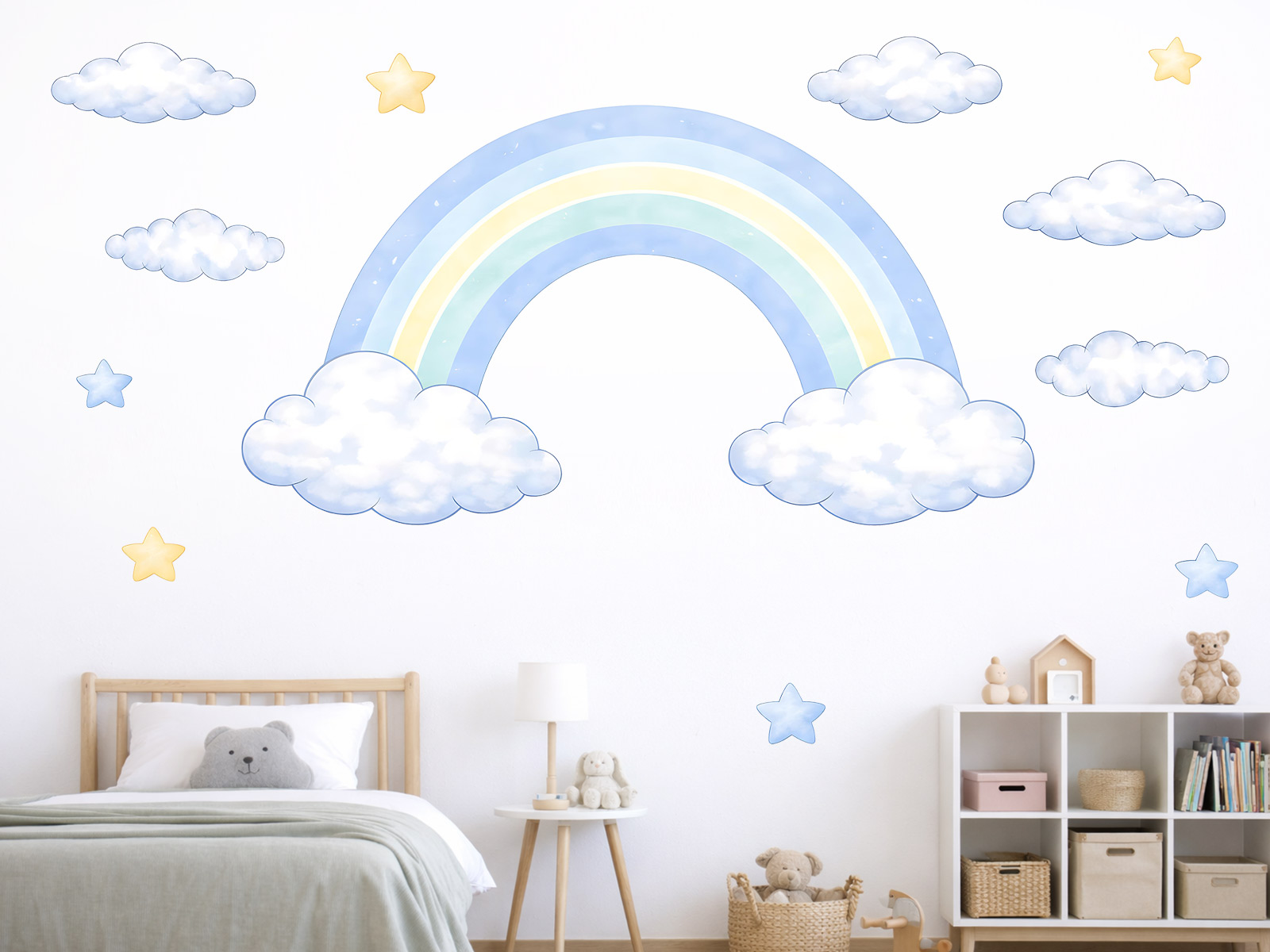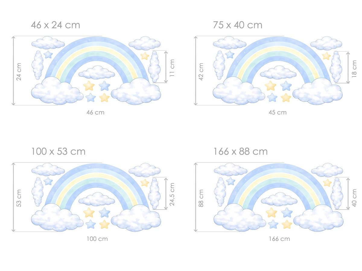 Nálepka na stenu „Rainbow for Boys“ vnesie do detskej izby pokojnú, snovú atmosféru plnú jemných farieb a hravých detailov. Dominantná pastelová dúha v modrých a svetlých odtieňoch je doplnená nadýchanými oblakmi a drobnými hviezdičkami, ktoré spolu vytvárajú harmonický a upokojujúci motív ideálny do detskej izby, herne alebo spálne. Ilustrácia pôsobí ľahko, vzdušne a priateľsky, krásne vynikne na svetlej stene a dá sa ľahko kombinovať s iným detským nábytkom a dekoráciami. Oblúk obsahuje jednotlivé prvky, ktoré vám umožnia vytvoriť vlastnú kompozíciu podľa priestoru a fantázie vášho dieťaťa a premeniť izbu na miesto plné pohodlia, fantázie a sladkých snov.