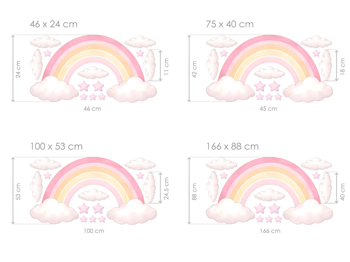 Nálepka na stenu „Dúha pre dievčatá“ vnesie do detskej izby jemnú rozprávkovú atmosféru plnú pokoja, radosti a snov. Pastelová dúha v ružových a krémových odtieňoch, doplnená nadýchanými oblakmi a drobnými hviezdičkami, pôsobí ľahko, harmonicky a veľmi jemne. Motív je navrhnutý tak, aby krásne ladil s interiérom dievčenských izieb, vytváral útulné prostredie a podnecoval fantáziu a pocit bezpečia. Dúha sa stáva prirodzenou dominantou steny, zatiaľ čo jednotlivé doplnky okolo nej dotvárajú jemný a vyvážený celok. Ideálna voľba do izby malej princeznej, ktorá vytvorí kúzelné miesto na hranie, oddych a sladké sny.