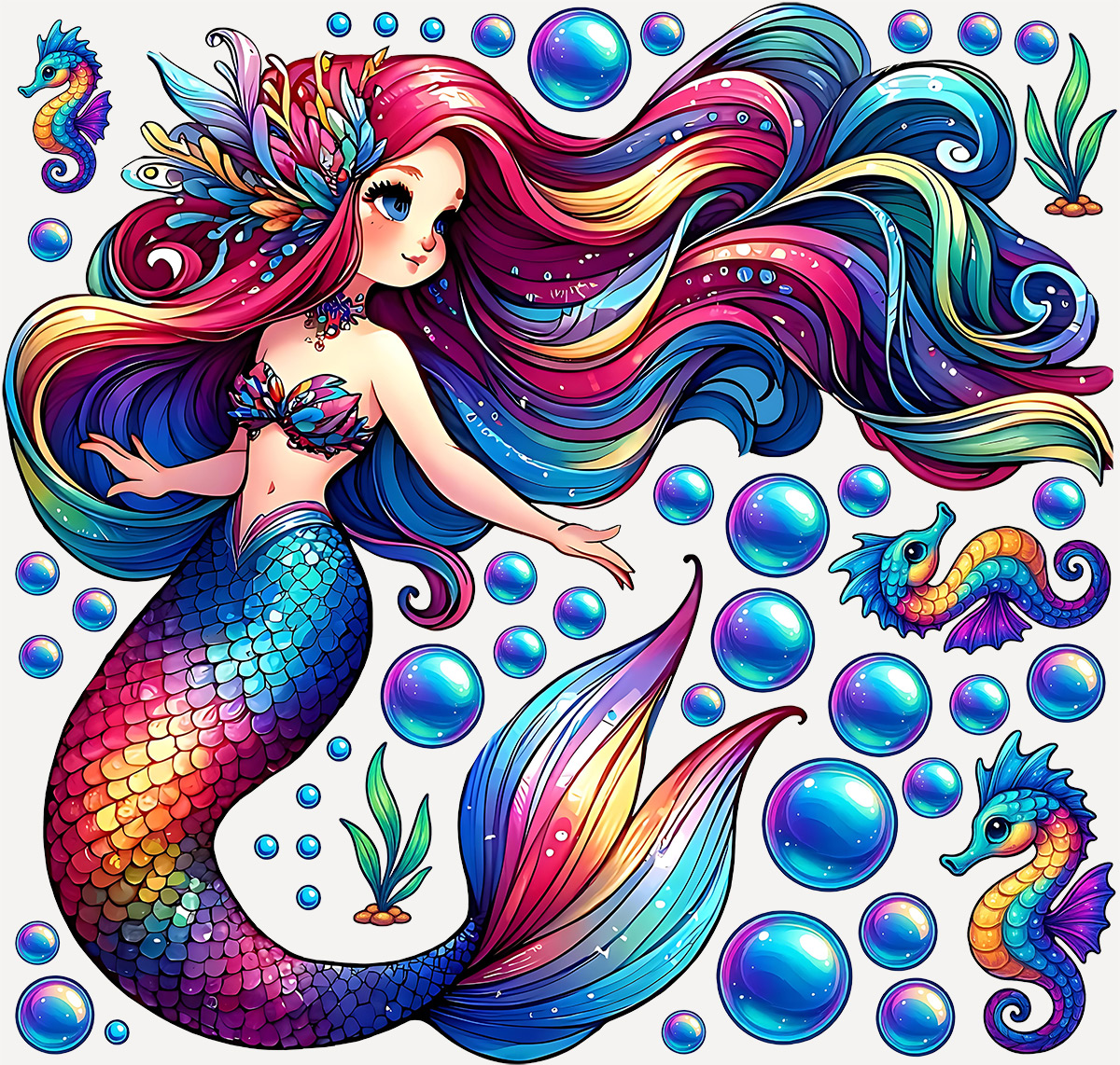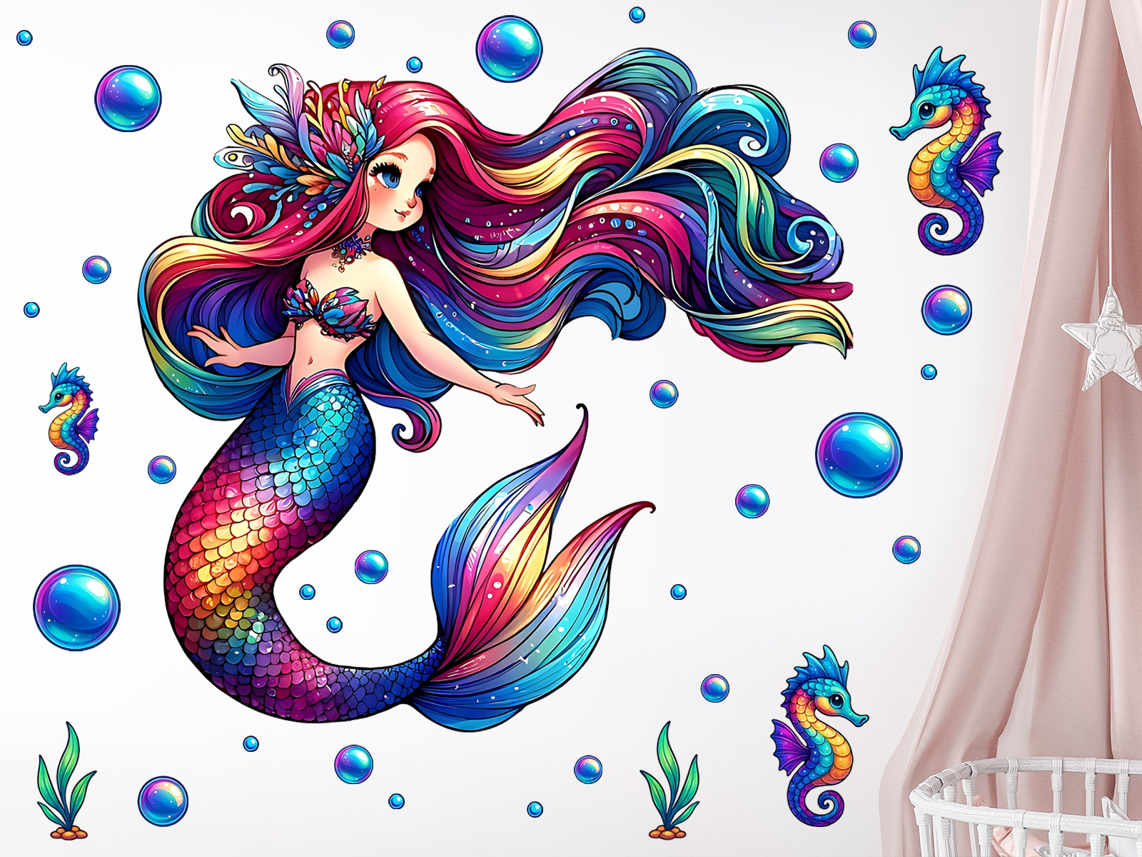 Vneste do detskej izby pohádkovú atmosféru podmorského sveta so sadou „Farebneá morská víla“. Očarující ilustrácie víly s dlh&´mi dúhovými vlasmi a trblietavým chvostom premení každú stenu v magické more plneé farieb, svetla a fantázie. Súčástí sady sú také morští koníci, bublinky a vodní rastlinky, ktoré doladí celý motív a umožní vytvoriť vlastní morskú scénu podπa predstáv vašeho diaítete. Každý prvok je samostatná samolepka, takže si môžete hrát s rozmístením a vytvori originální dekoráciu presne na míre.