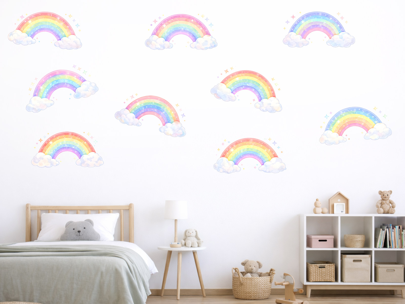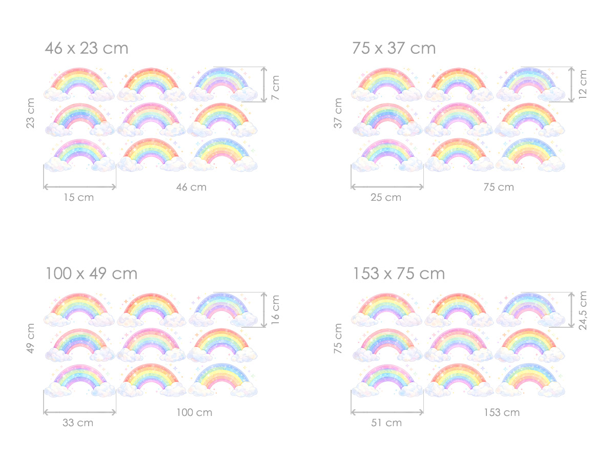 Nálepka na stenu „Farebné dúhy“ vnesie do detskej izby jemnú hravosť, radosť a čarovnú atmosféru plnú pastelových farieb. Súprava obsahuje niekoľko roztomilých motívov dúhy s nadýchanými oblakmi a malými hviezdičkami, ktoré môžete na stene usporiadať podľa svojej fantázie – vytvorte svetlý vzor nad detskou postieľkou, rozprávkovú oblohu alebo veselý akcent v celej izbe. Jemné farebné prechody a akvarelový štýl vytvárajú pokojný a harmonický efekt, vďaka čomu sú ideálne pre bábätká aj staršie deti. Bohaté odtiene ružovej, modrej, žltej a zelenej krásne dopĺňajú svetlý interiér a dodávajú priestoru pocit pohodlia, bezpečia a snovú detskú fantáziu.