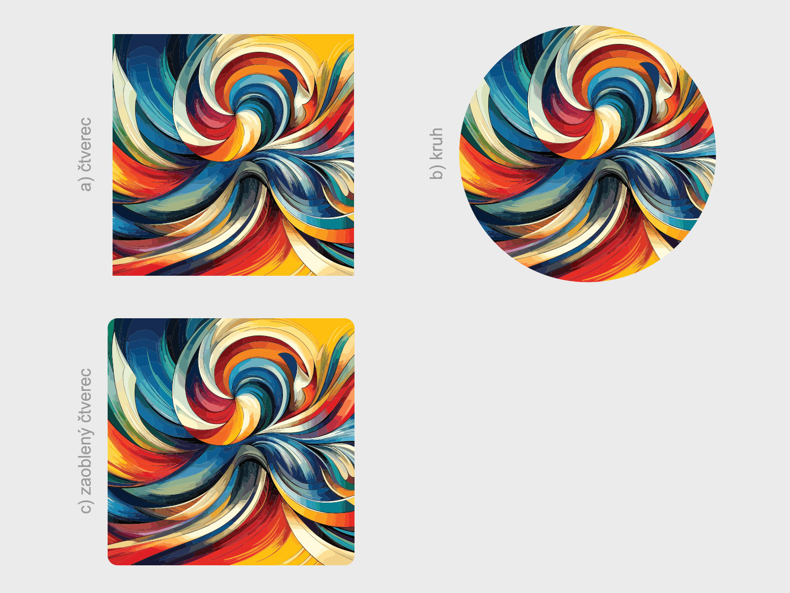 Tvar je možné zmeniť. Možno vybrať a) štvorec, b) kruh, c) zaoblený štvorec viď fotogaléria. Ak teda máte zájem o iný tvar ako na hlavní fotografiu, stačí v posledním kroku objednávky do pola poznámka napísa napr. "kruh". Jedná sa o tištený samolepící plakát - imitácia maľby Je možné zvoliť aj ľubovoľneý vlastní rozmer hárku pomocí posuvníku alebo klikání na "Vetší", "Menší"