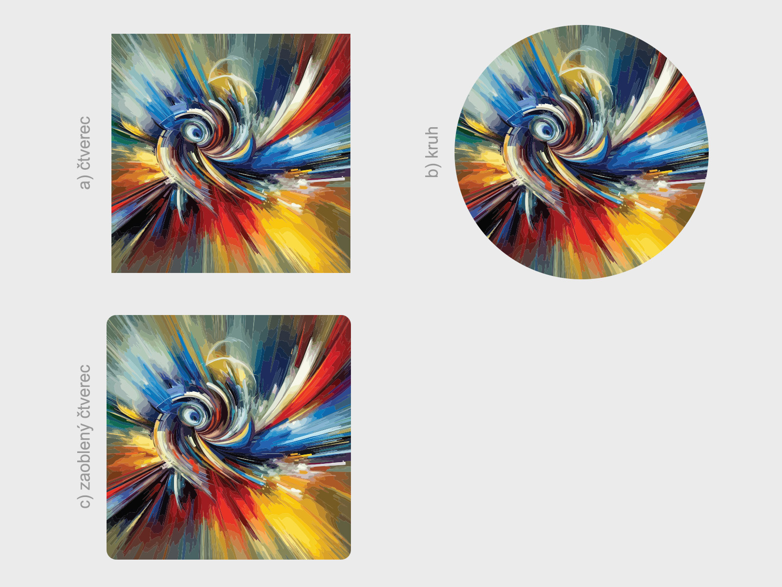 Tvar je možné zmeniť. Možno vybrať a) štvorec, b) kruh, c) zaoblený štvorec viď fotogaléria. Ak teda máte zájem o iný tvar ako na hlavní fotografiu, stačí v posledním kroku objednávky do pola poznámka napísa napr. "kruh". Jedná sa o tištený samolepící plakát - imitácia maľby Je možné zvoliť aj ľubovoľneý vlastní rozmer hárku pomocí posuvníku alebo klikání na "Vetší", "Menší"