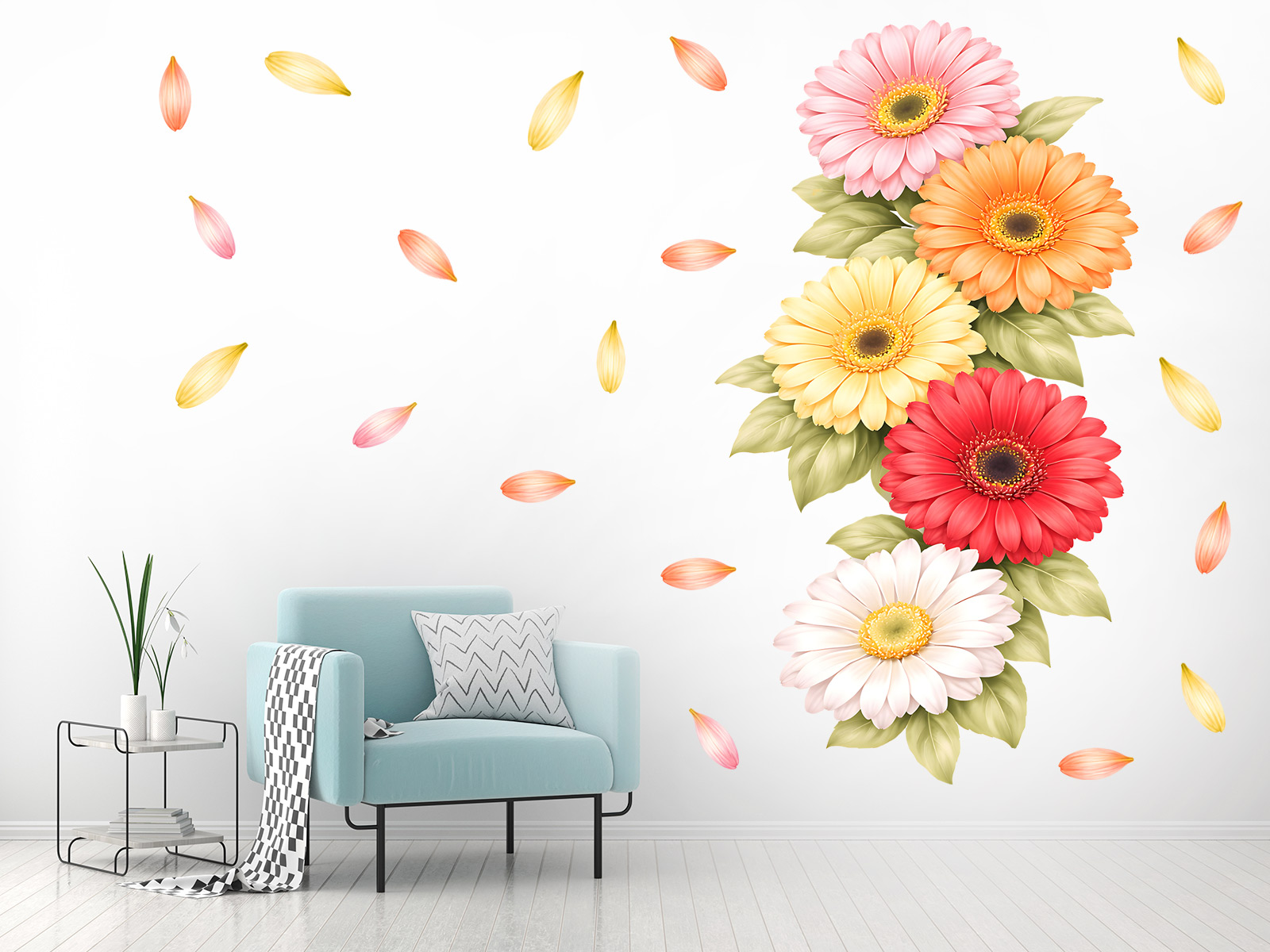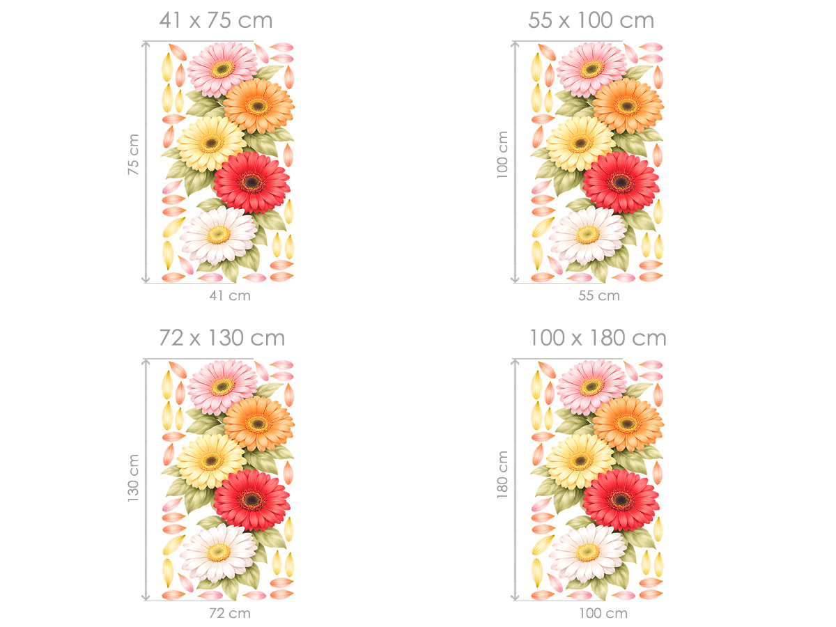 Nálepka na stenu s motívom gerber prináša do interiéru výrazný, ale zároveň elegantný kvetinový akcent. Kompozícia farebných gerber v odtieňoch ružovej, oranžovej, žltej a červenej je usporiadaná do jemného vertikálneho aranžmánu, ktorý opticky predlžuje priestor a pôsobí veľmi dekoratívne. Akvarelové spracovanie dodáva kvetom ľahkosť a prirodzené farebné prechody, zatiaľ čo zelené listy krásne vyvažujú celú kompozíciu. Lietajúce okvetné lístky okolo motívu dodávajú dynamiku a pocit jemného pohybu. Nálepka sa skvele hodí do obývacej izby, spálne, chodby alebo napríklad do kútika s kreslom, kde vytvorí príjemnú a útulnú atmosféru. Vďaka svojmu vertikálnemu tvaru je ideálna aj na užšie steny alebo vedľa nábytku. Perfektná voľba pre všetkých, ktorí chcú do svojho domova vniesť farby, eleganciu a svieži kvetinový štýl.